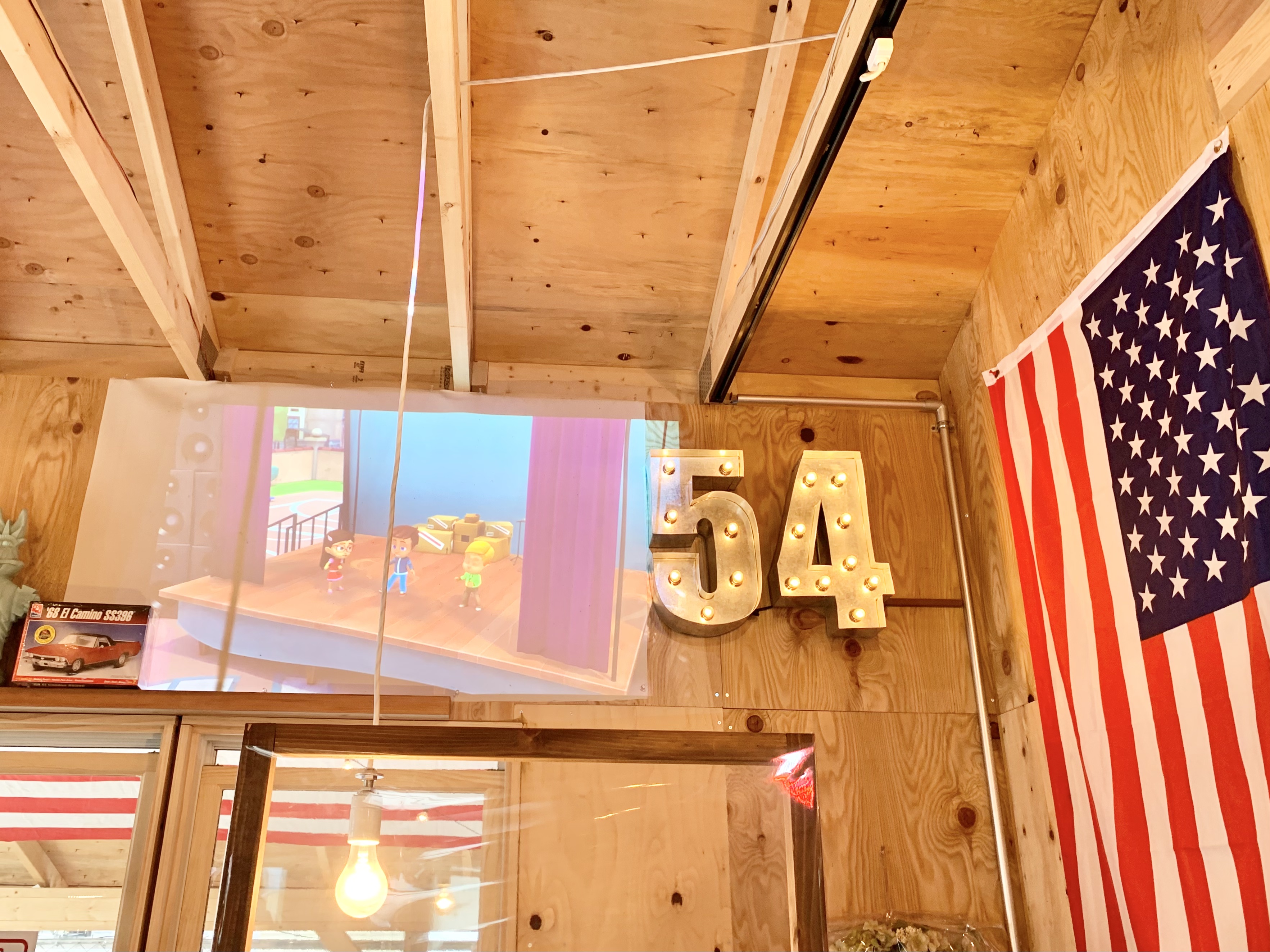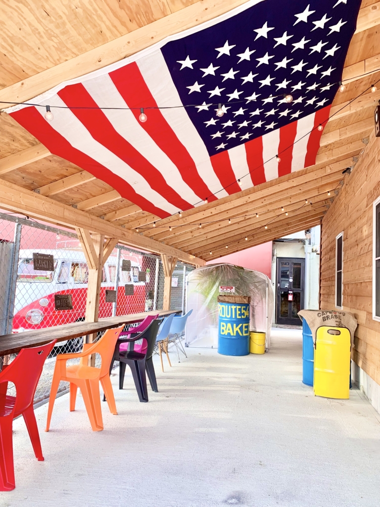 お店の横にはアメリカンなガレージも!カラフルな椅子に星条旗、思わず写真を撮りたくなるカラフルさです。