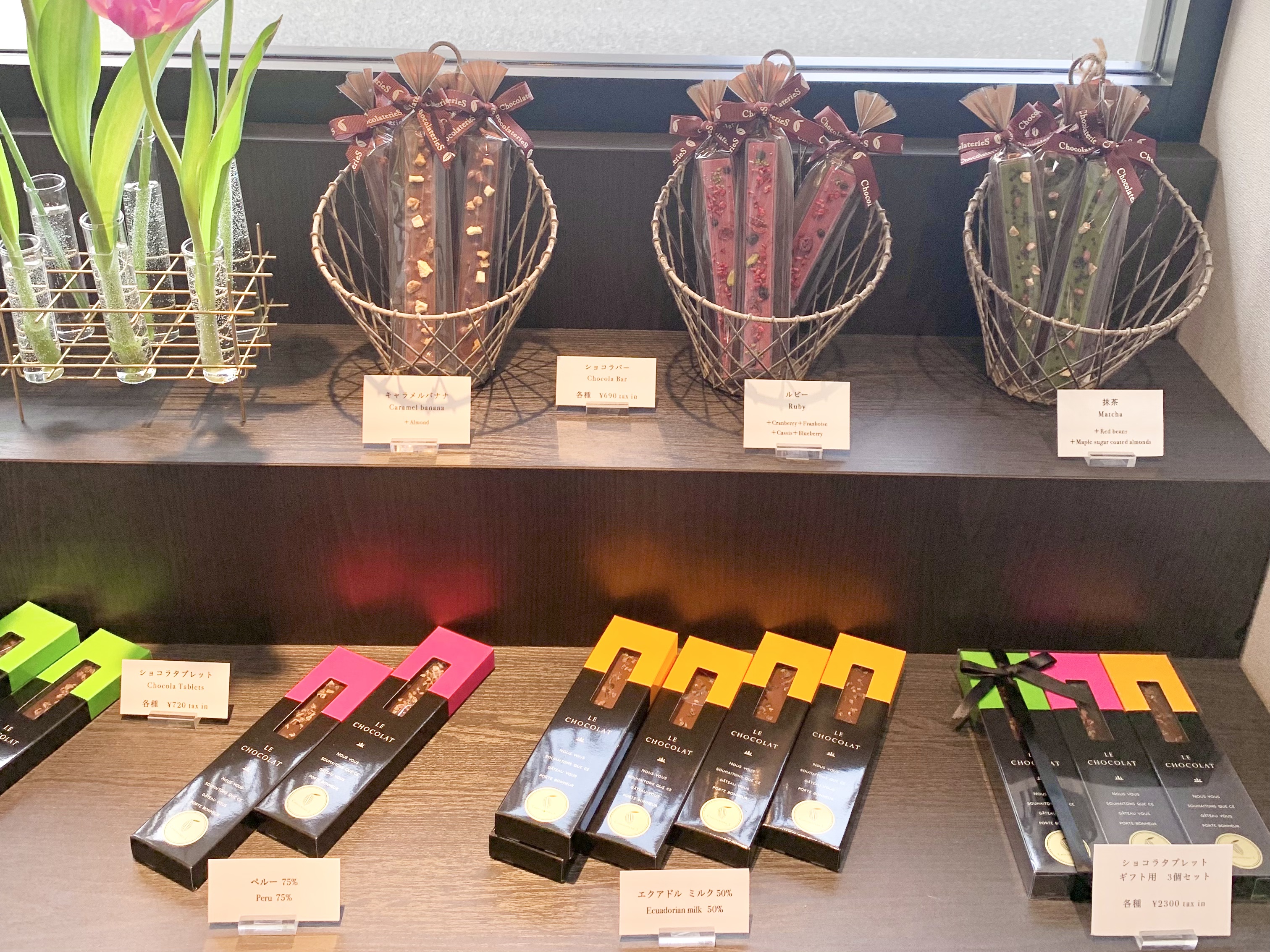 お花のディスプレイもある店内にはチョコバーなどもありました。
