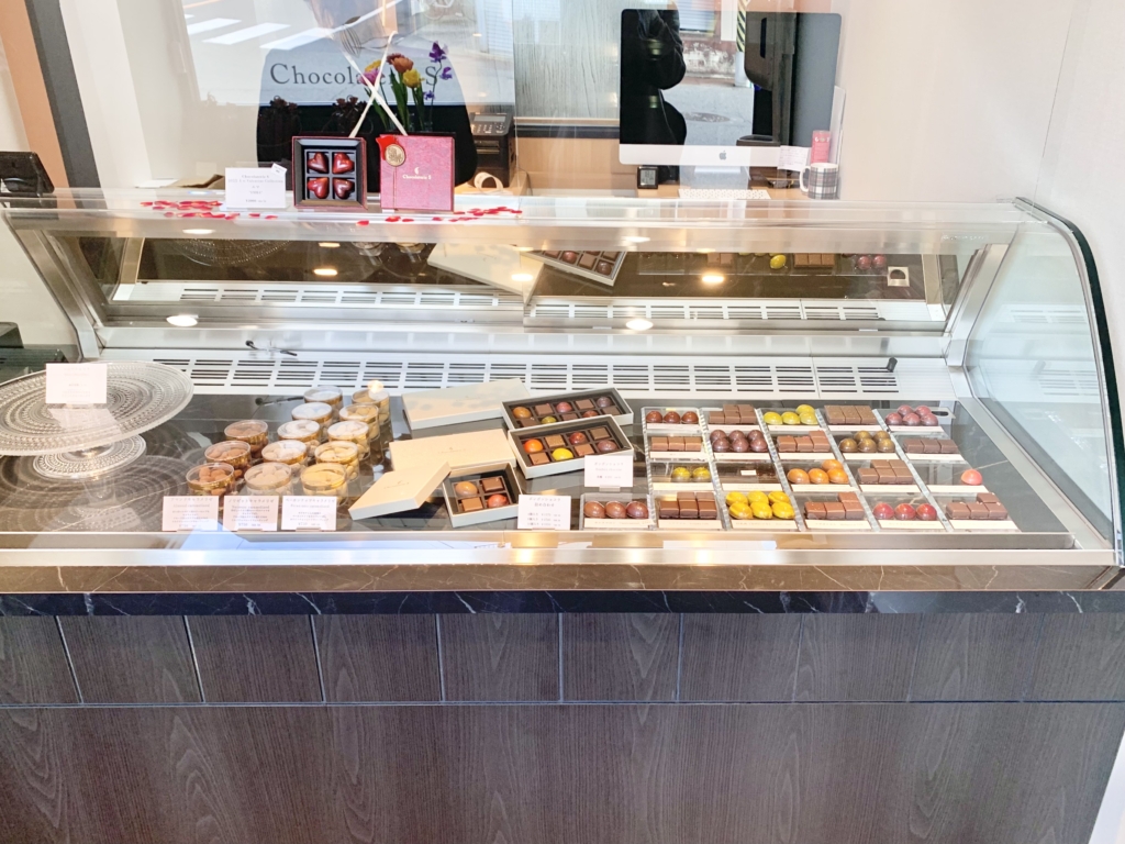 店内にはショーケースに並ぶ20種類ものボンボンショコラたち!