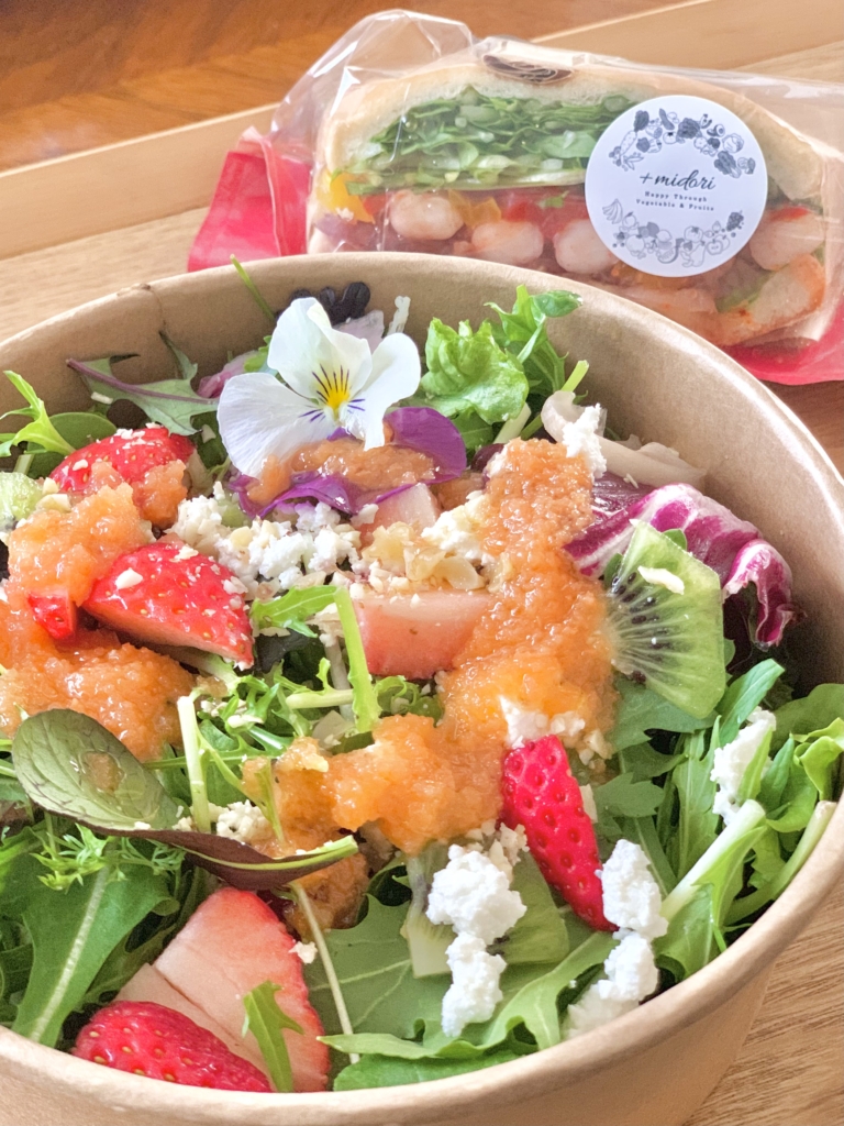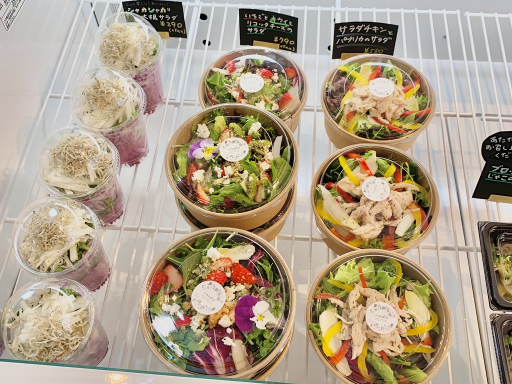 新鮮な野菜を使ったサラダ、ジュースやスムージー、お弁当、サンドイッチ、スープなどが揃います