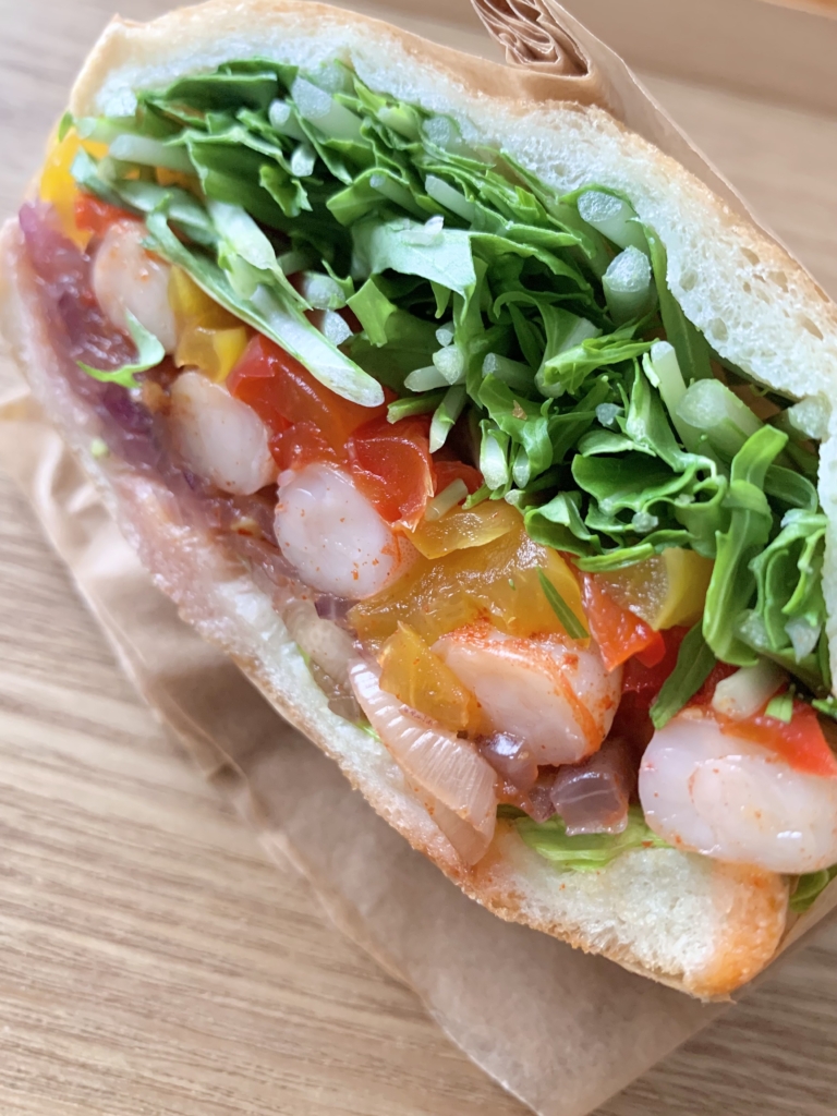 フルーツサンドも迷ったけど、エビのスイートチリサンドとサラダにしました。