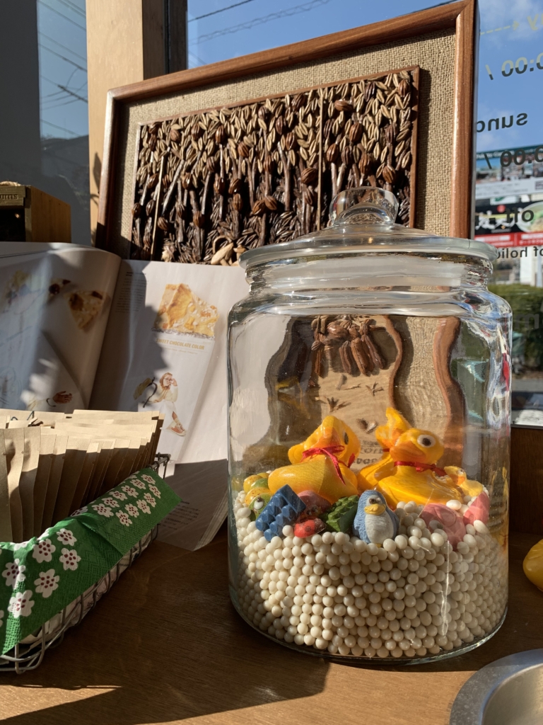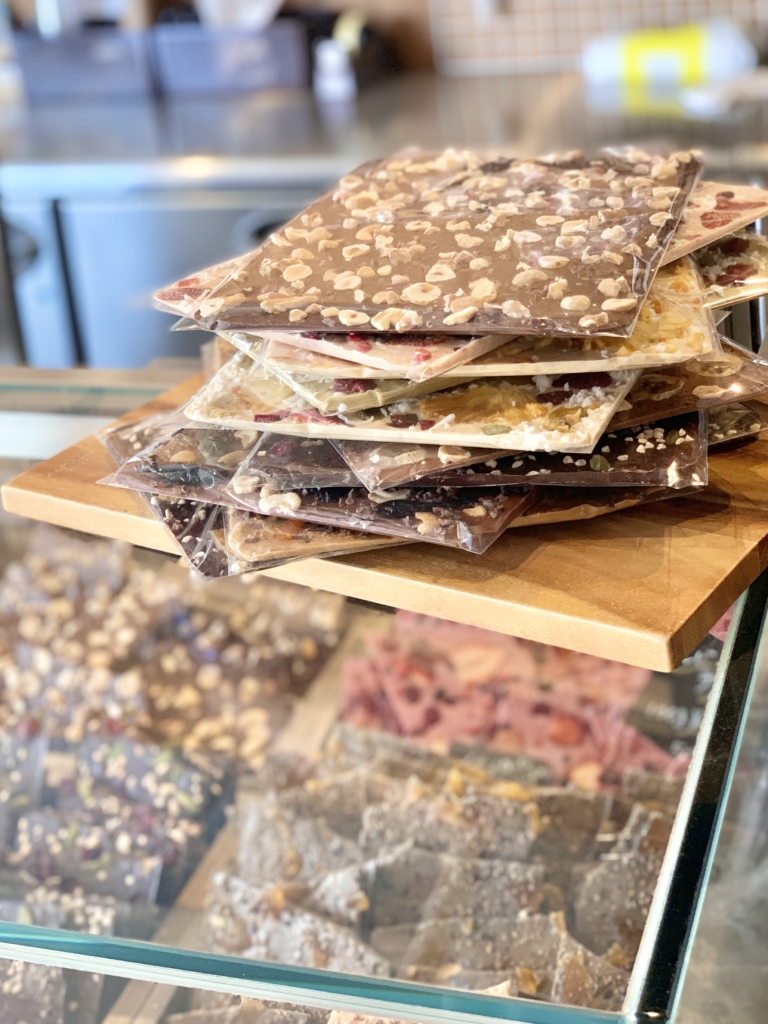 大きなガラス窓で自然光の明るい店内。お買い物中に2名ほどお客さんが来られ、クランブルチョコを何種類か購入されていました。