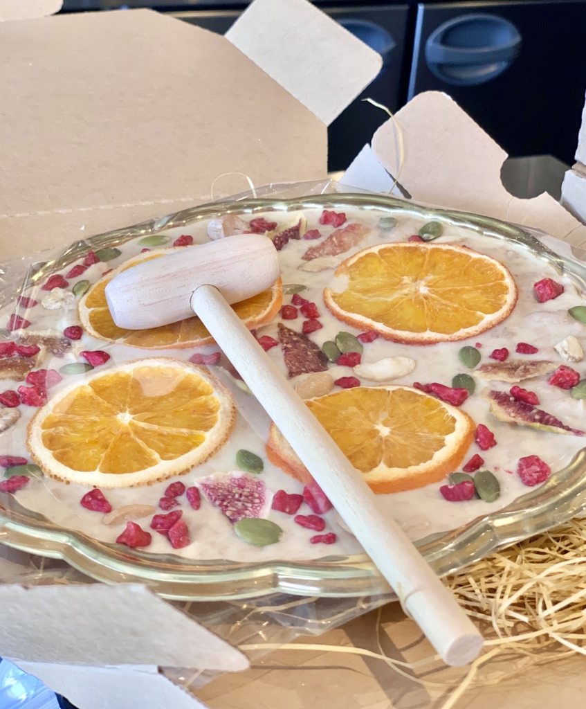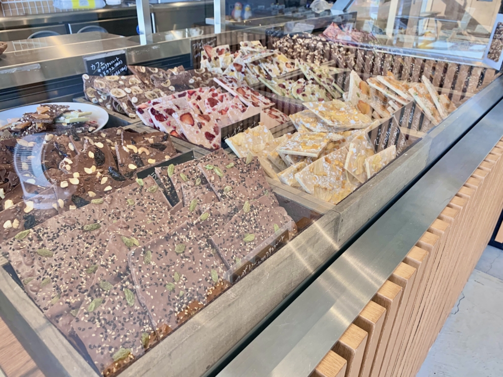 L字型のガラスのショーケースには、他にも計り売りされているクランブルチョコレートや、木槌がセットになったスマッシュチョコレートもあって目移りしてしまいそう!