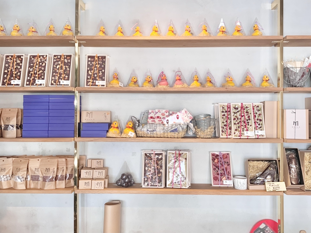 ボンボンショコラの他にも、遊び心のあるチョコレートがたくさん!メレンゲとサクサク生地が練り込まれた「クランブルチョコレート」は欲しい分量を計り売り。木槌で割って食べる「スマッシュチョコレート」、アヒル、大仏、ペンギンの形をした「ファニーチョコレート」など