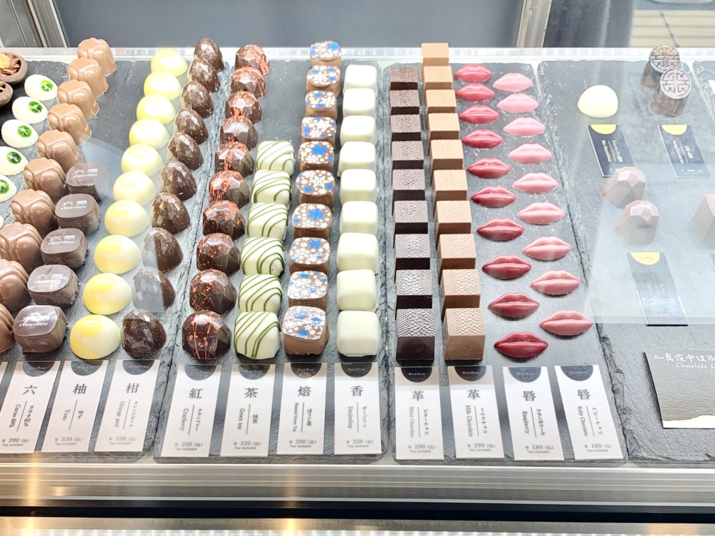 店内には20種類のボンボンショコラがずらり!漢字一文字でつけられた商品名はどれも個性があって迷います。