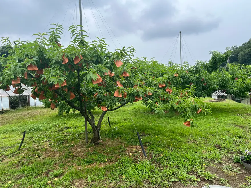 桃茂実苑観光農園まで歩いていると、広い敷地にたくさんの桃が見えてきました!