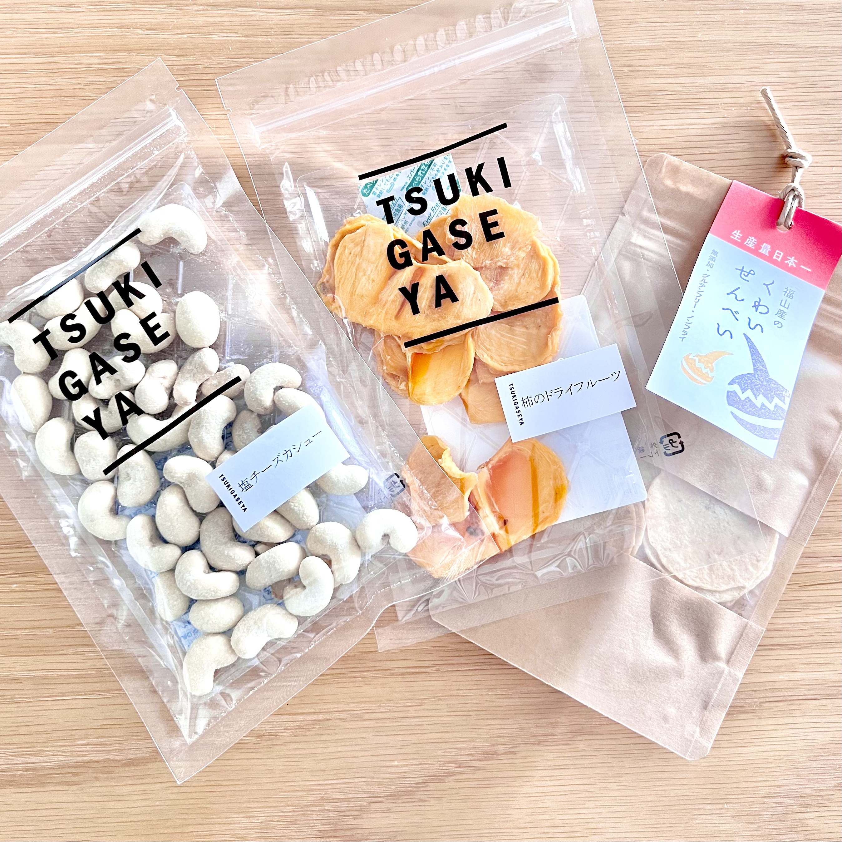 珍しい柿のドライフルーツと、塩チーズカシューナッツ、広島県のメーカーさんが作っているくわいせんべいを購入することに。