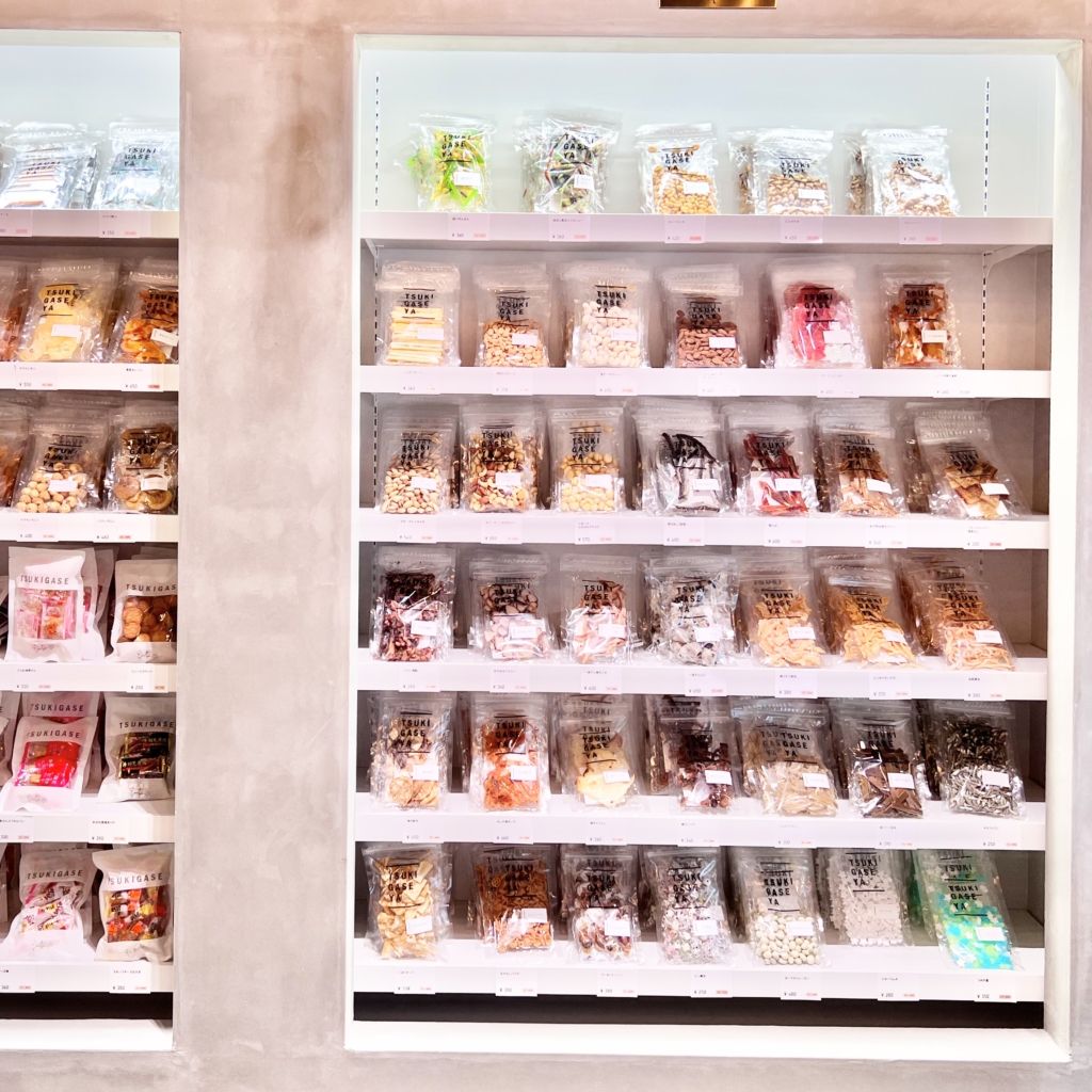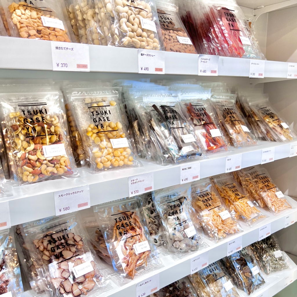 おやつ、おつまみ、ナッツ、チョコなどが勢揃い。業務用で、飲食店さんへおやつやおつまみを販売していた、昭和43年創業の月ヶ瀬から、個包装が揃う新店として登場。