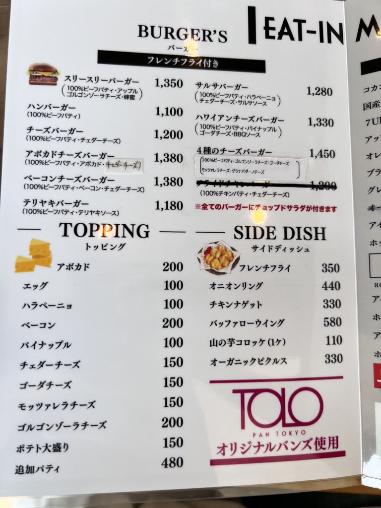100%ビーフパテに、広島県内では滅多に食べることのできない東京のトロパンのバンズ、チーズもチェダーチーズ、ゴーダチーズ、モッツァレラチーズ、ゴルゴンゾーラが用意されていて、好みでトッピングも可能。