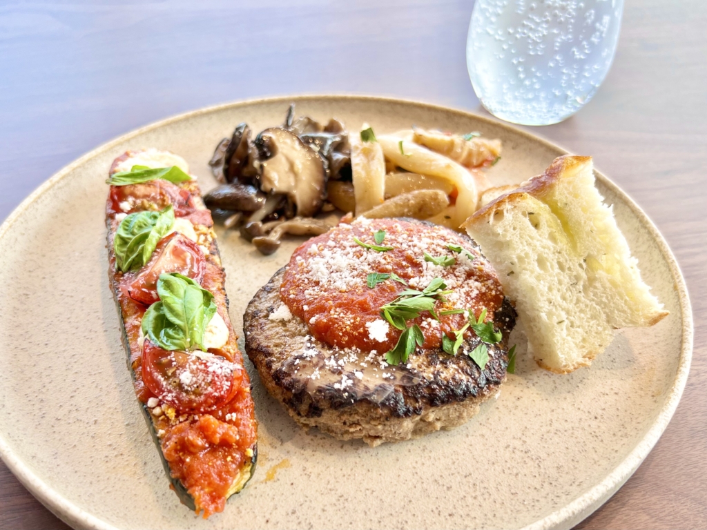 帰宅後、ハンバーグを温めて、お皿に盛り付けていただきました。ハンバーグはボリュームたっぷり、ジューシー!お惣菜もお酢の効いたさっぱりしたものから、ズッキーニの食感が楽しいものまで、どれも美味しくて満腹です。さらに、フォカッチャが美味しーーい!この日はローズマリーのフォカッチャでした。