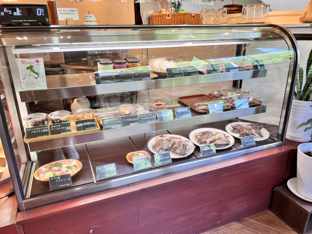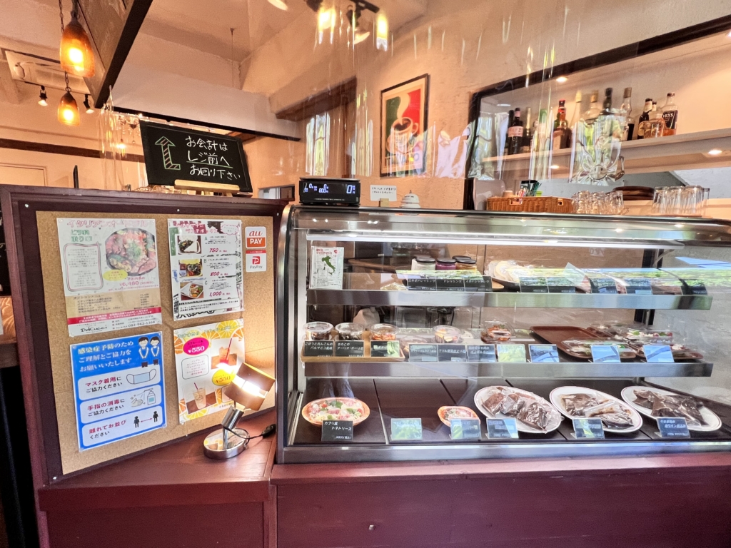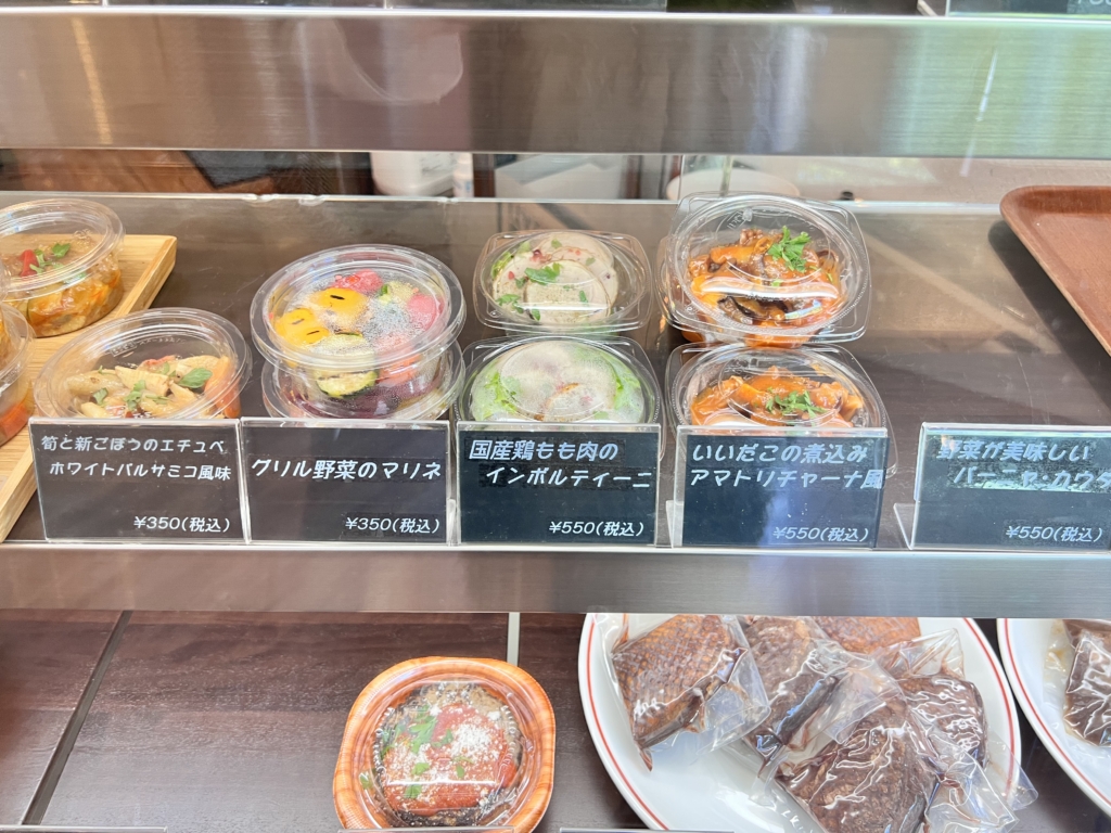 入ってすぐにお惣菜が並ぶショーケース。すでに売り切れになっていたものもありましたが、メインになりそうなお肉系から、前菜系までラインナップ豊富!毎日20種類くらいのお惣菜が並ぶそうです。この日は残り15種類程度から選べました。