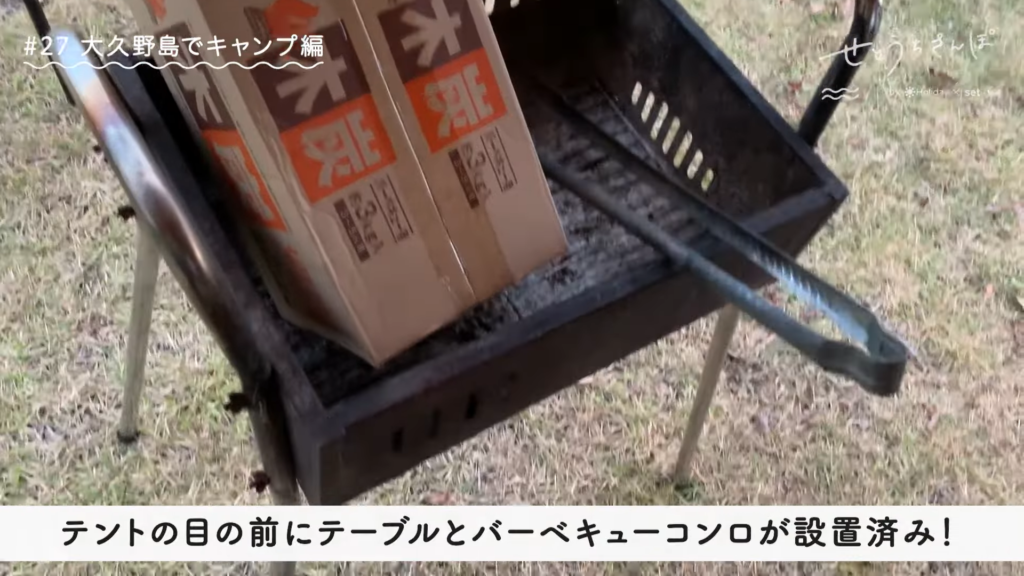 テントの目の前にテーブルとバーベキューコンロが設置済み!