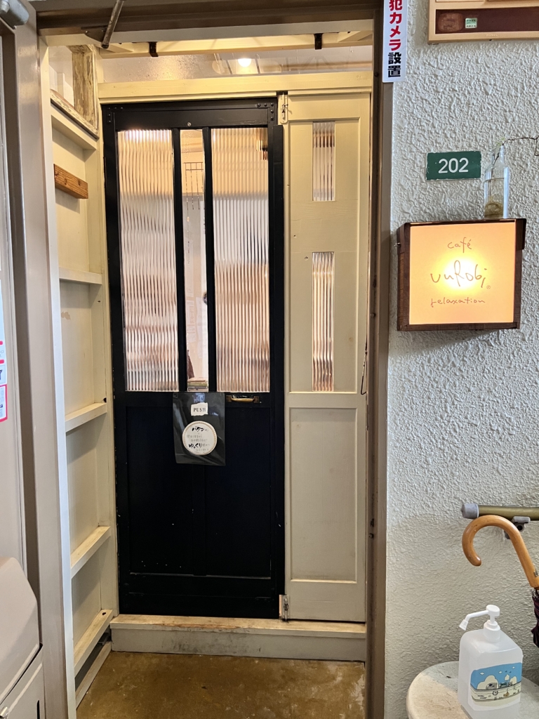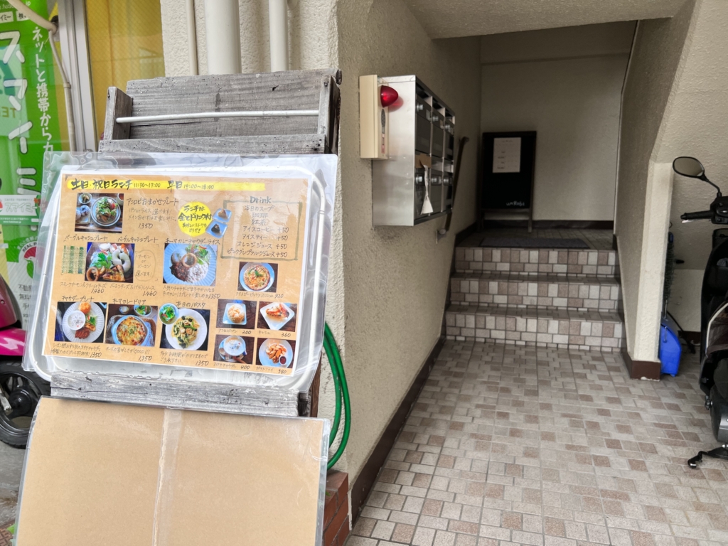 看板の奥の階段を登って2階へ。オレンジ色の暖かいランプの灯るお店の看板と、なんだかお家にお邪魔するかのような雰囲気の扉が。
