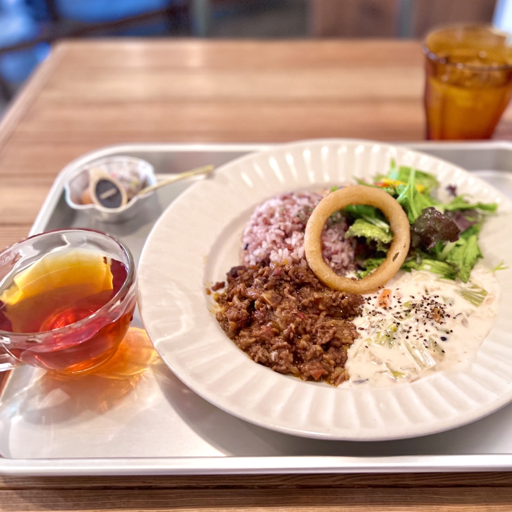 玄米ご飯に、キーマカレー、クラムチャウダー、サラダ。紅茶もセットでついていたので食事と一緒にお願いしました。