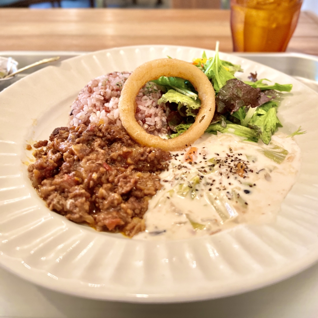 ランチはキーマカレードリアランチ(1100円)。土日メニューより250円安いけどドリンクはなしなので50円くらいお得♪