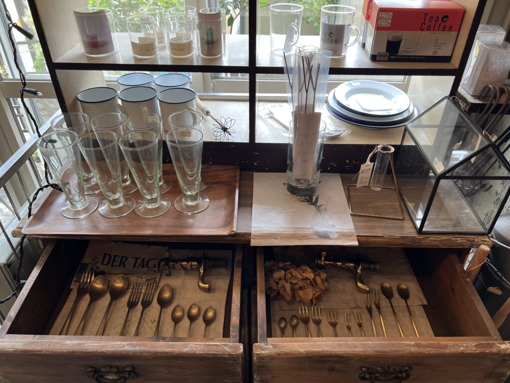 一歩店内に入ると、広いスペースに並ぶテーブル席と、ナチュラルなアンティーク感いっぱいな可愛らしい雑貨が目に止まります。