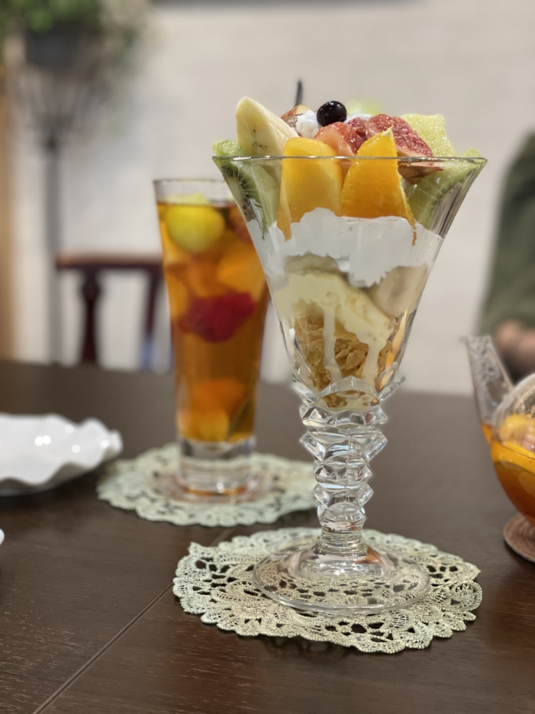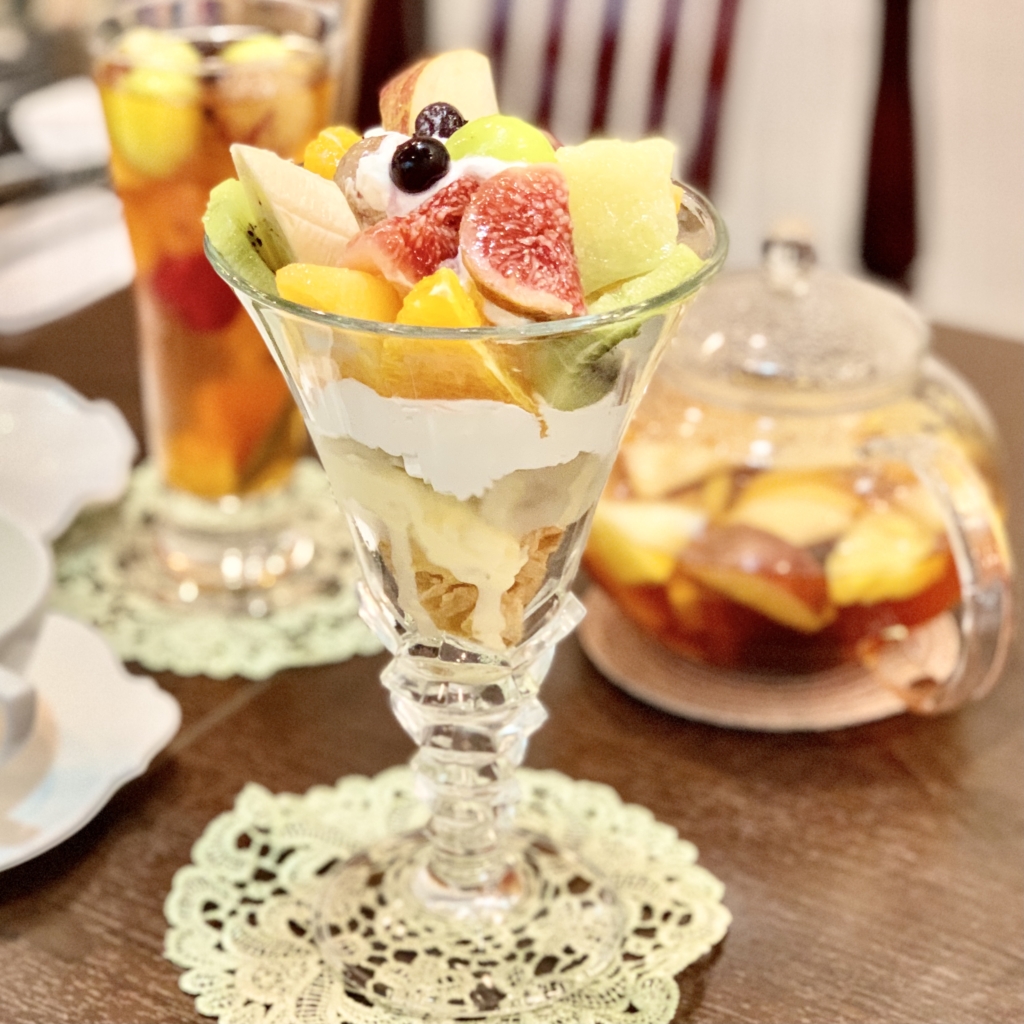 早速フルーツパフェとフルーツティーを注文!茶葉はニルギリを使用されています。ニルギリは、インド南部の紅茶で、味わいや香りのバランスがとってもいい紅茶!フルーツの味を邪魔することなく、おいしさを味わえる、アイスティーにもぴったりの茶葉ですよ!