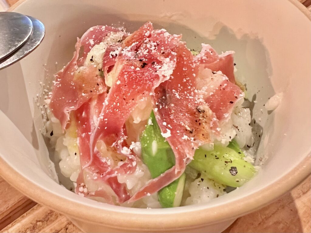 最後はアスパラと生ハムのリゾット。どれも美味しくてお得で話も弾みました。