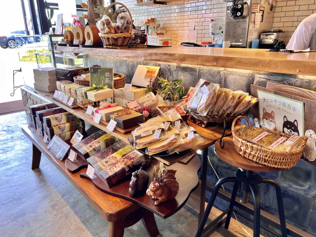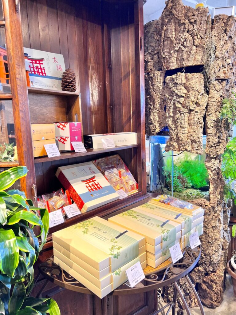 レジ横までさまざまな商品が陳列。さすが、本店の品揃えと素敵なカフェ。普段広島駅などでも目にしていた櫟のワッフルを、改めて大切に作られた商品なんだと感じることができました。同じ商品でも、お店の雰囲気でこんなにも愛着が湧くなんて不思議です。