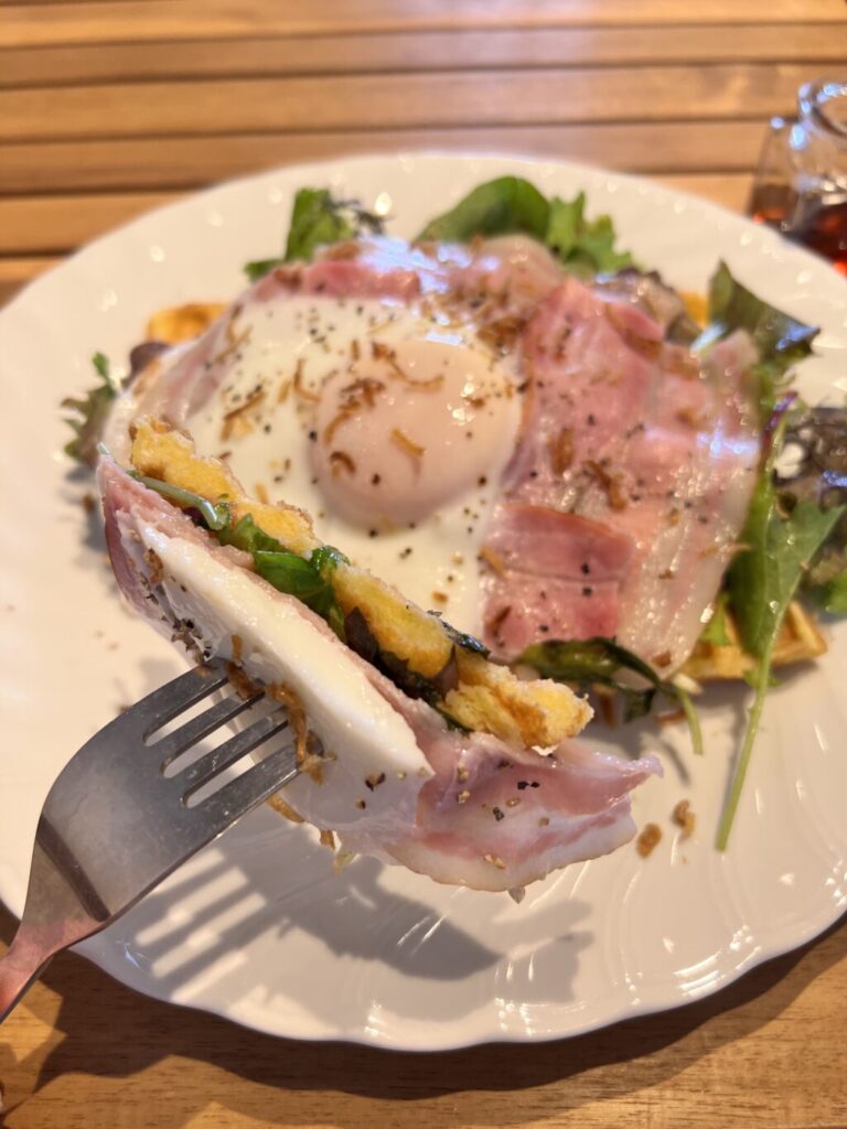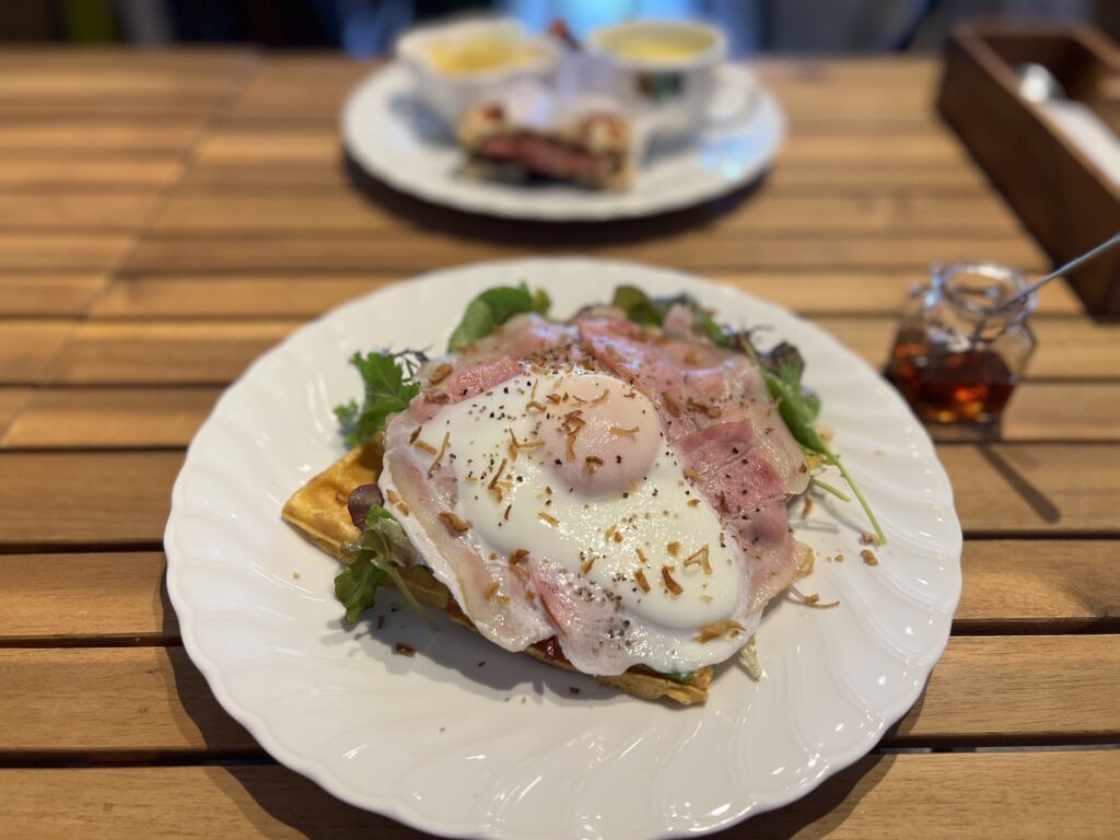 半熟に焼かれた卵と、酸味が効いてすっきりとしたドレッシングがかけられたベビーリーフのサラダ、優しい焼き具合のベーコンに、甘くてふわふわのワッフル!こどもさんでもきっと大好きな味です。カフェランチの雰囲気にもピッタリ!!