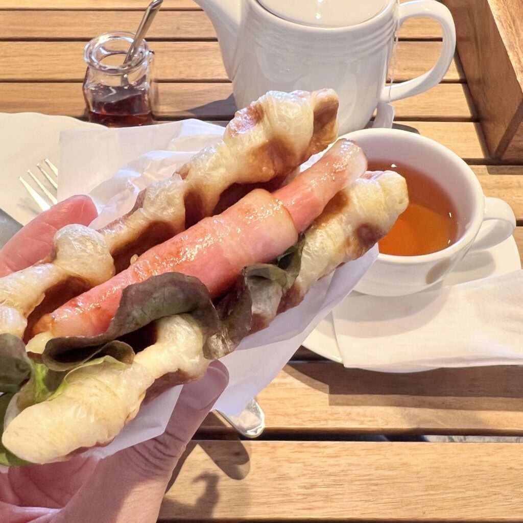 甘さ控えめのクロワッサン生地がぎゅっとワッフルになっていて、中にはベーコンとチーズ。チーズはベーコンに包まれるようにサンドして焼いてあったので手が汚れることもなくとっても食べやすく、どこを食べてもベーコンとチーズが味わえて嬉しい。