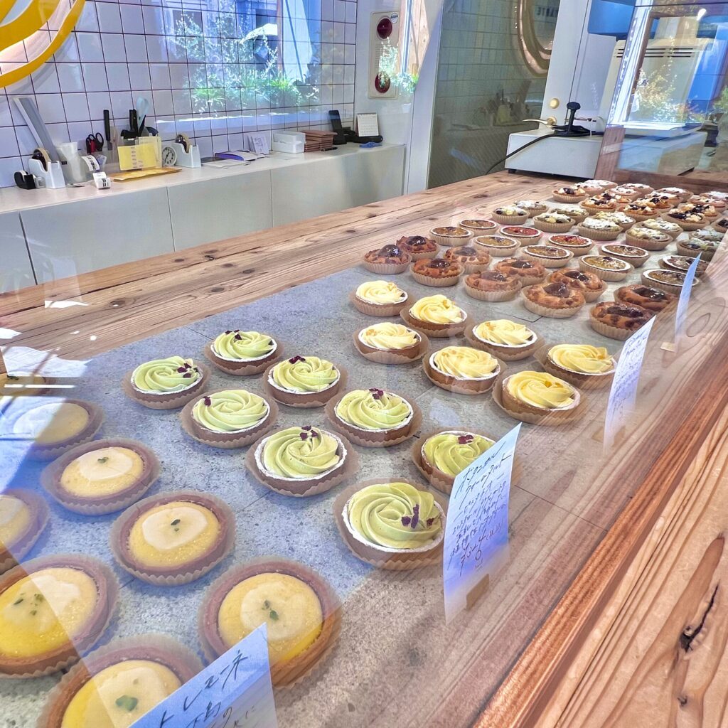 サクッと軽めのタルト生地に、焼き込み系、クリーム系、冷蔵生クリーム系の3ラインナップ、10種類以上がショーケースに並びます。