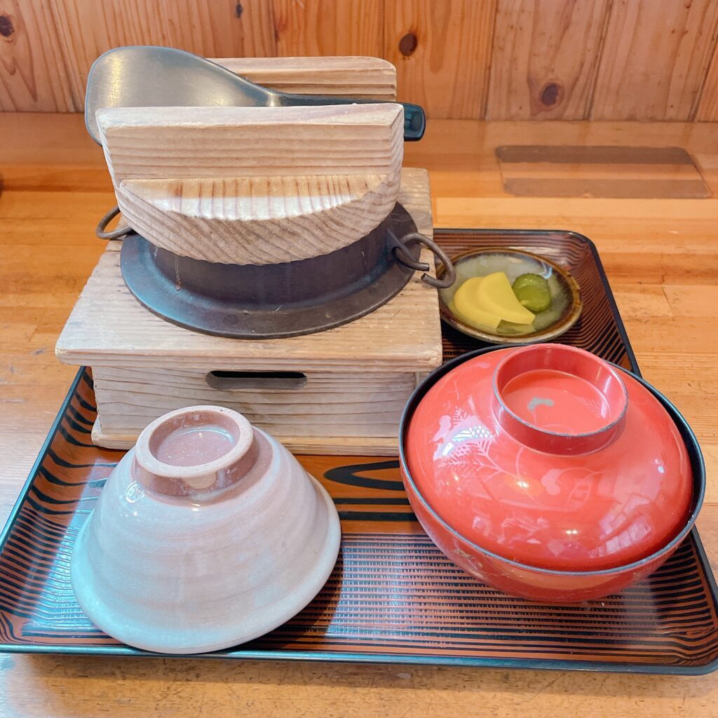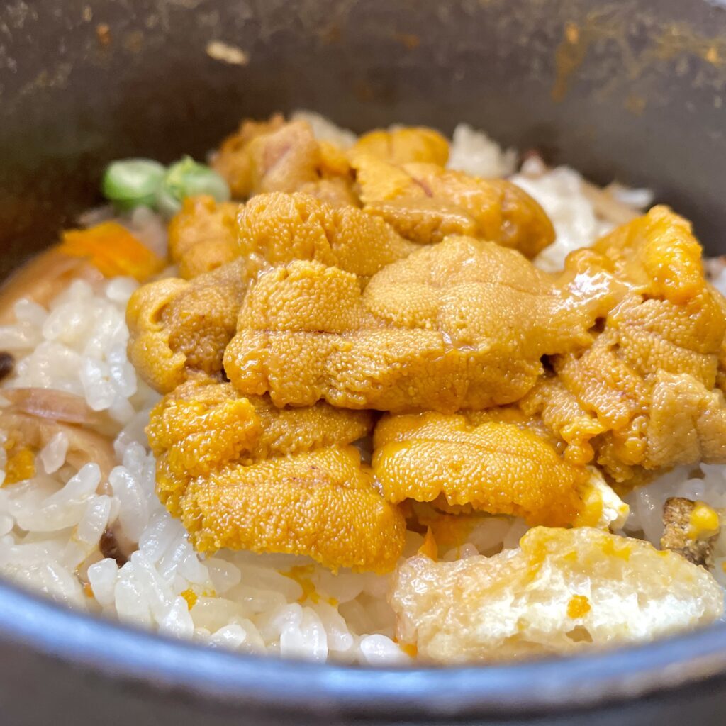 湯気が立ち上がる釜飯!仙崎港に水揚げされた生うにがたんまり乗っています!さらに、お汁は潮汁。上品!