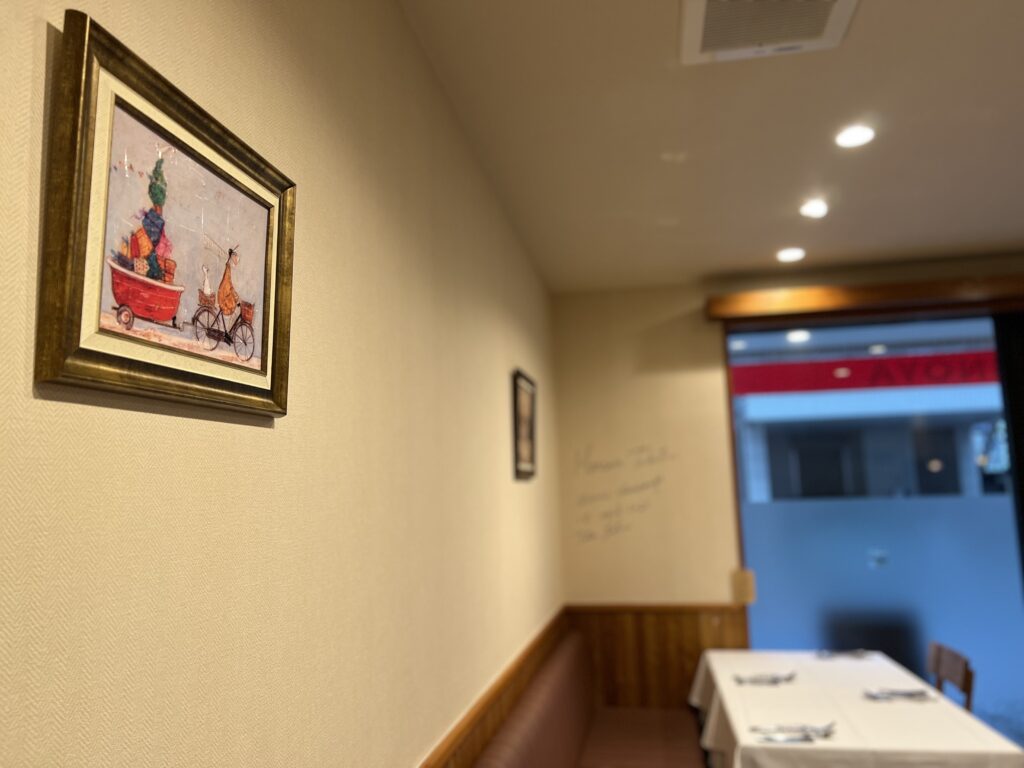 カジュアルだけどコースを楽しむ準備がきちんとされていて素敵です。壁にかかっている絵も可愛らしい♪