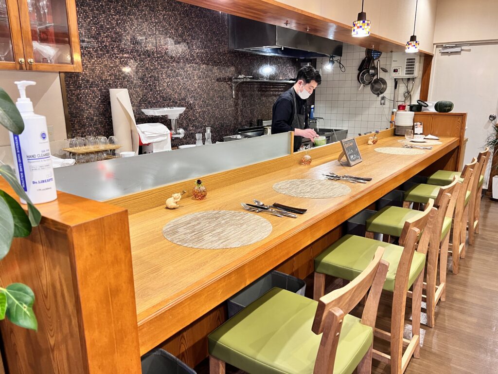 とっても清潔感のある店内に広々としたカウンター、テーブルクロスとカトラリーもセッティングされたテーブル席。