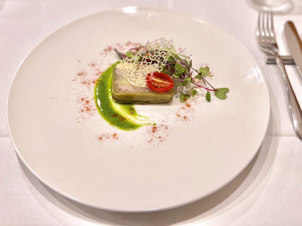 こちらも日によって変わるそう。この日は豚肉とじゃがいものテリーヌ。パプリカパウダーとパセリのソースが色鮮やか!そして、絶品!