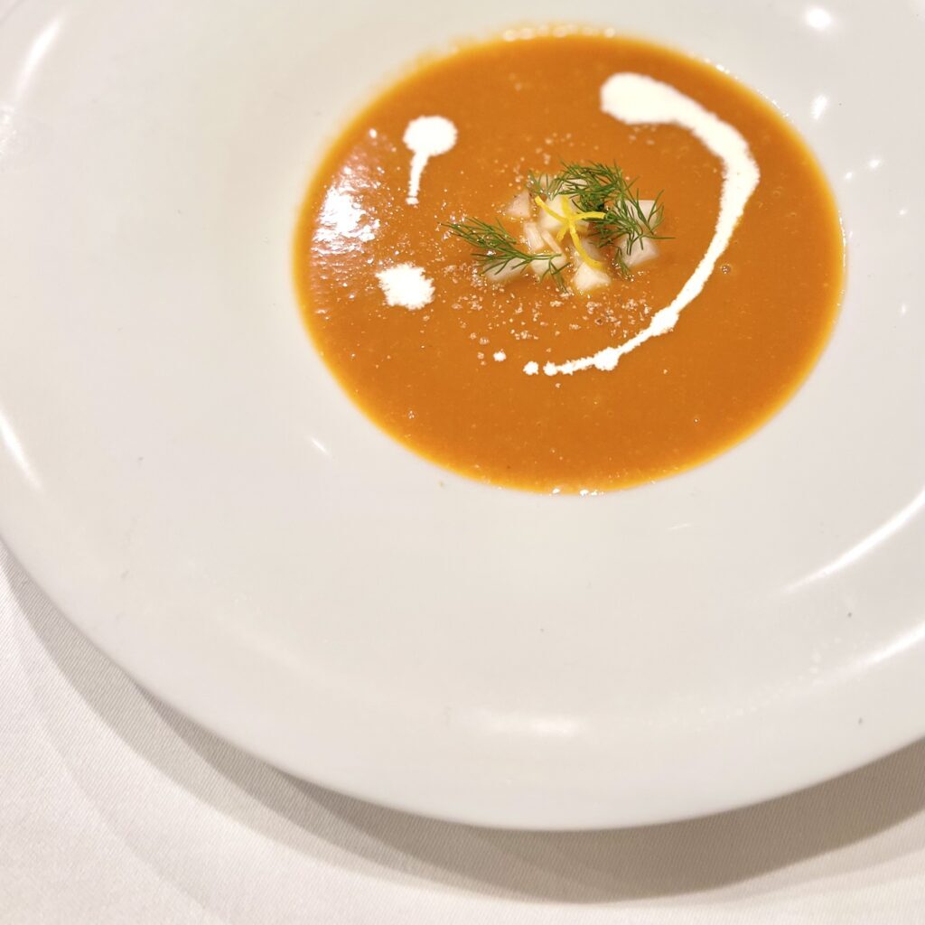 微笑みいただきました。トマトベースのスープに、食感が楽しい角切りの大根はオレンジでマリネ、ディルの香りも爽やかでとっても美味しい!