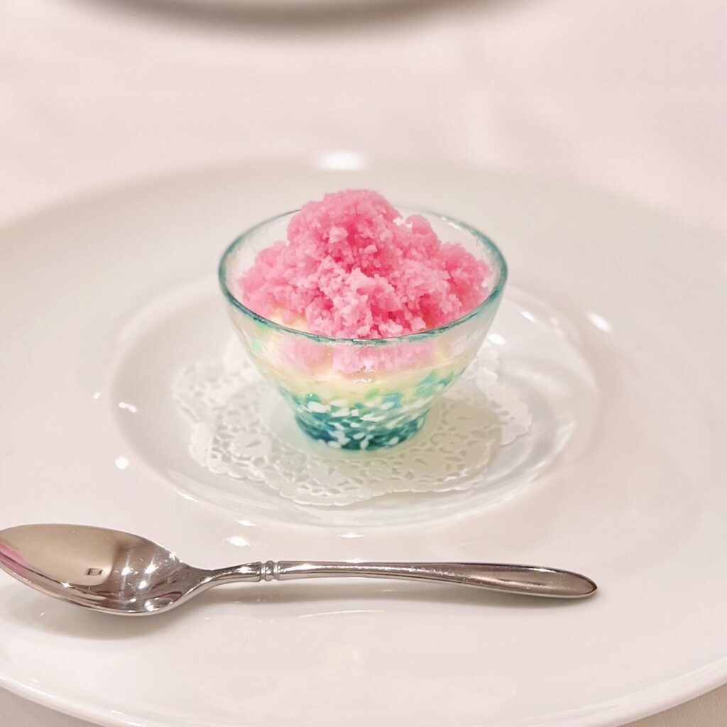 そしてデザートは季節のパルフェ。こちらも手作りされているそう。この日はアーモンドのパルフェ(アイスクリームのような感じ)に赤紫蘇のグラニータ(かき氷のような感じ)
