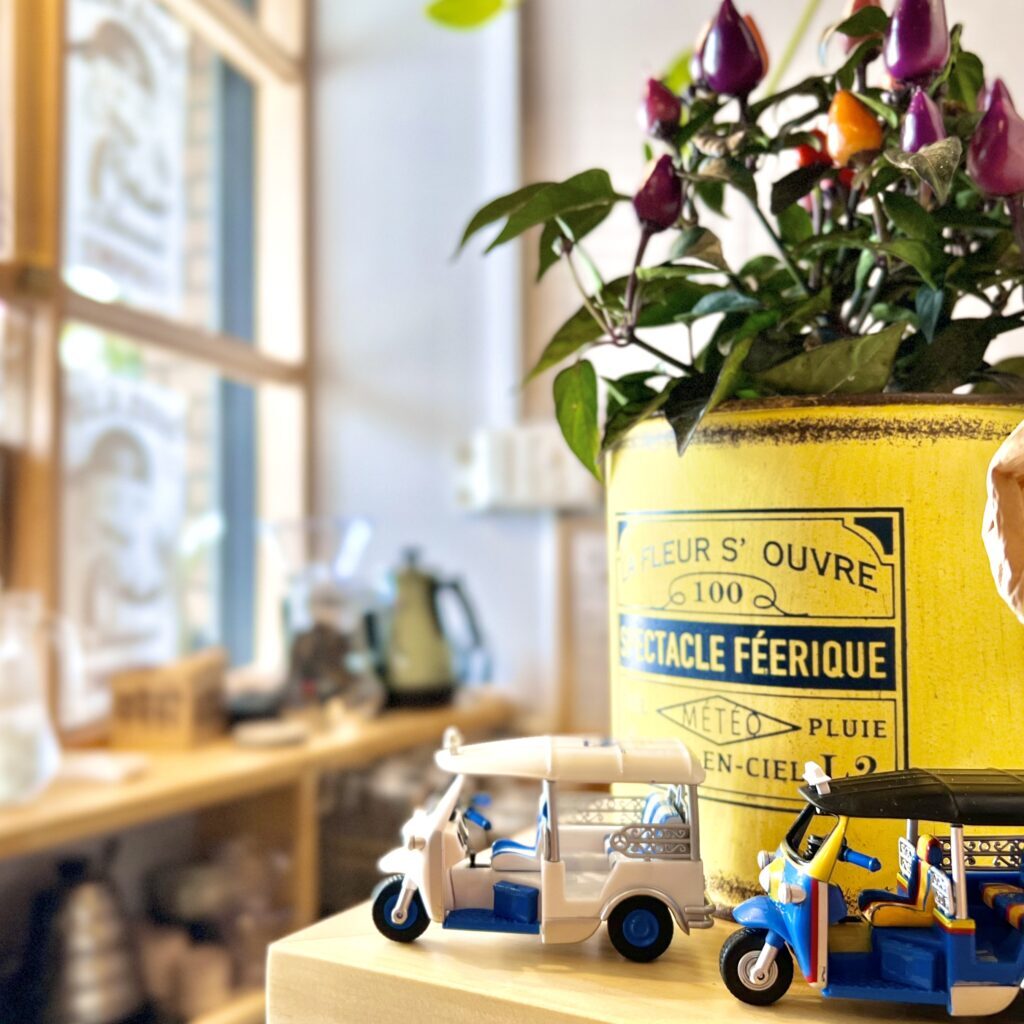 カウンターにはトゥクトゥクの置物やココナッツ缶など、可愛らしい雰囲気。