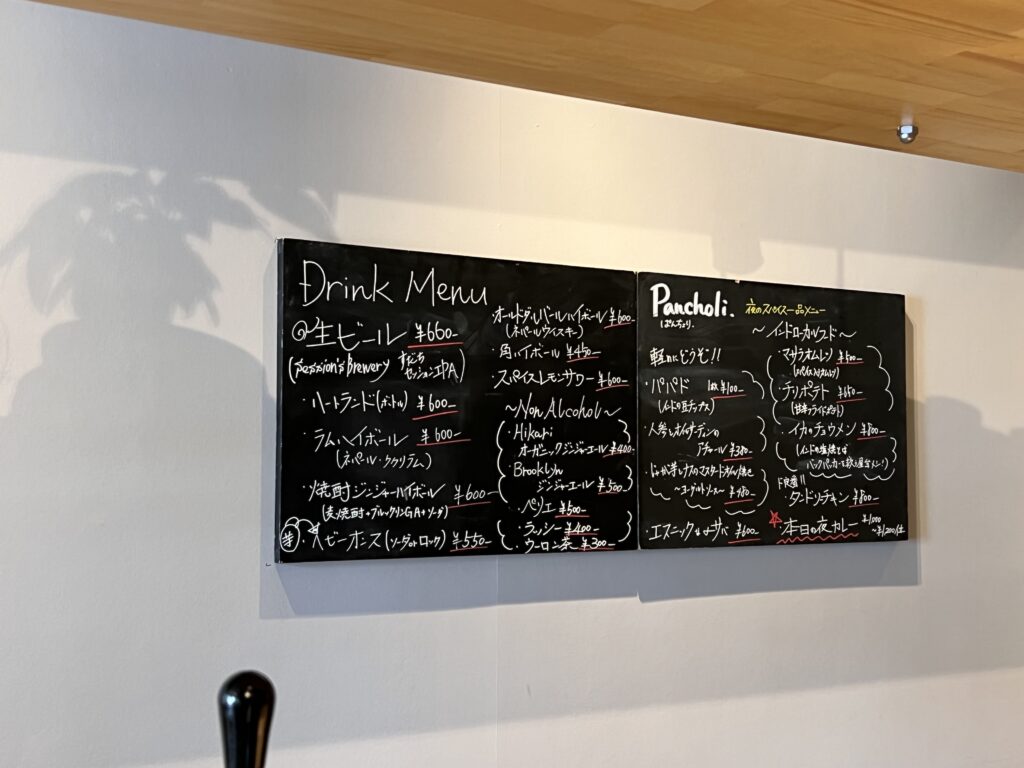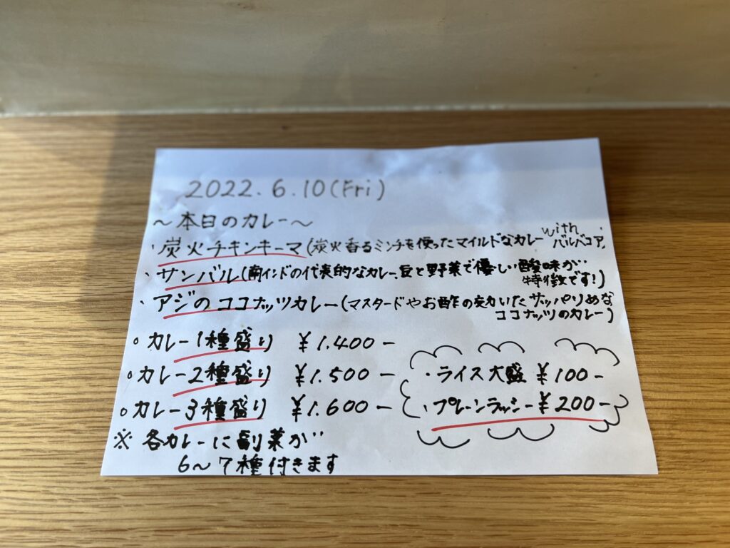 キッチンの黒板には夜のスパイス一品メニューも書いてありました。
