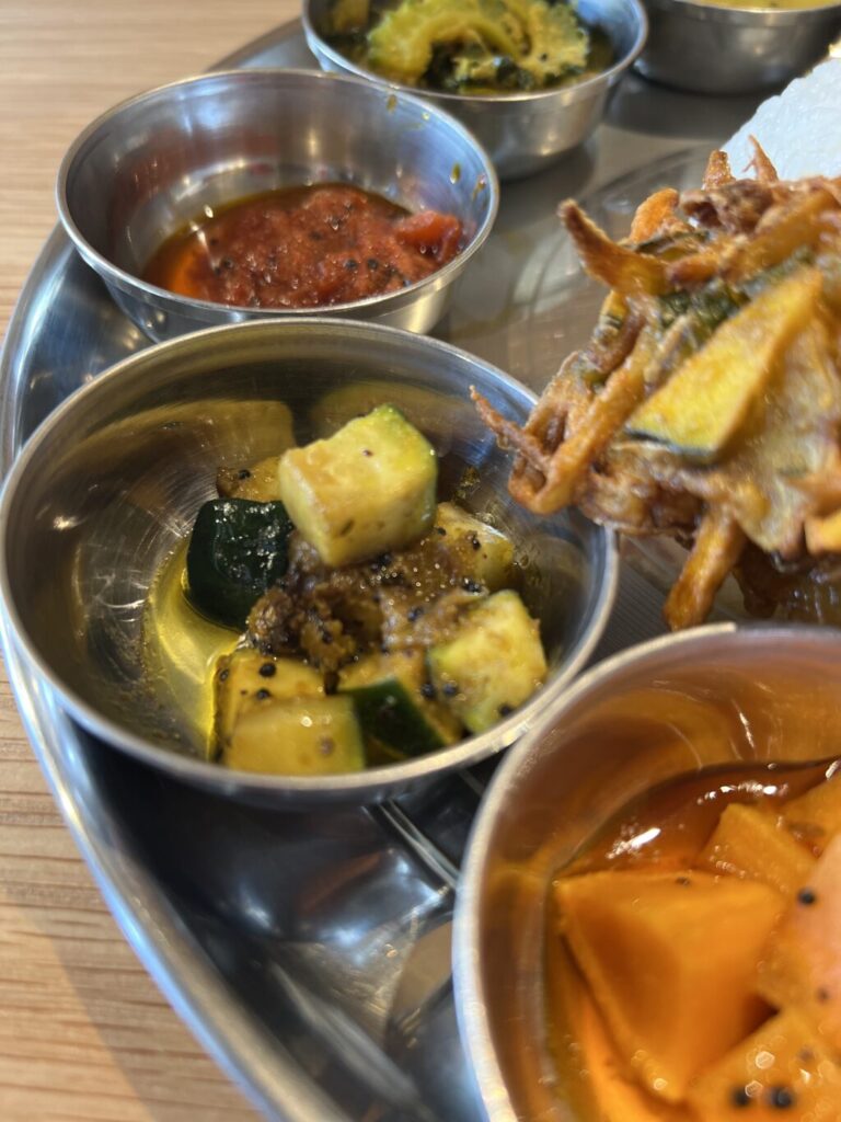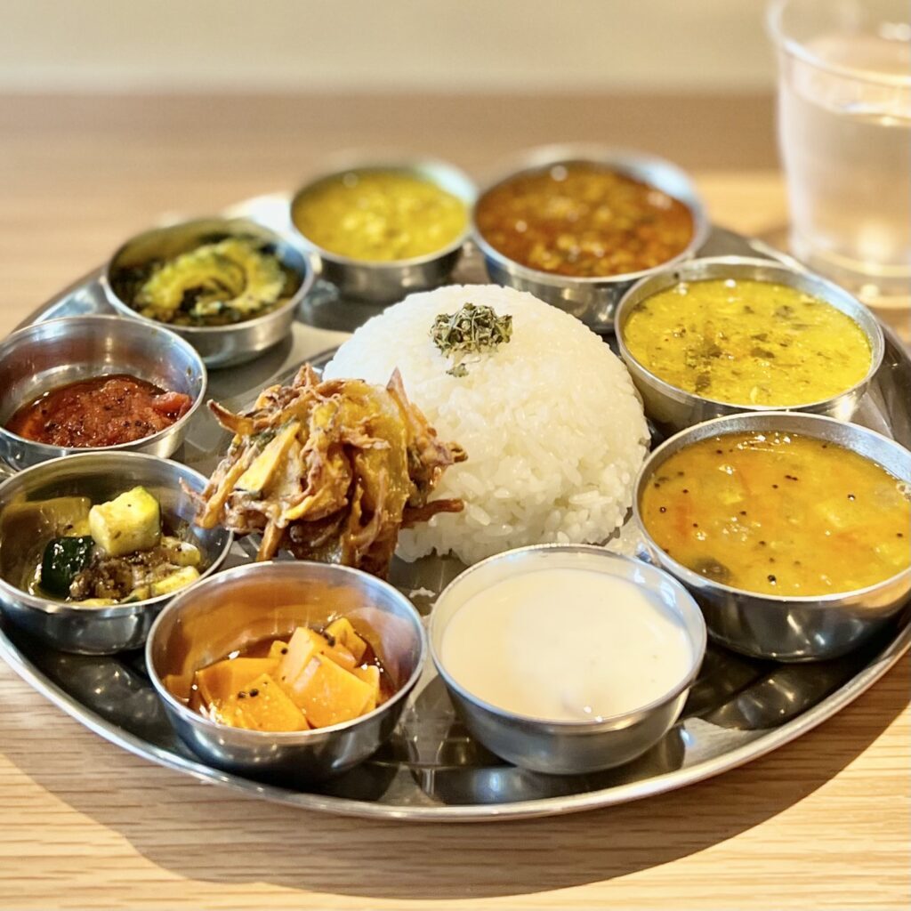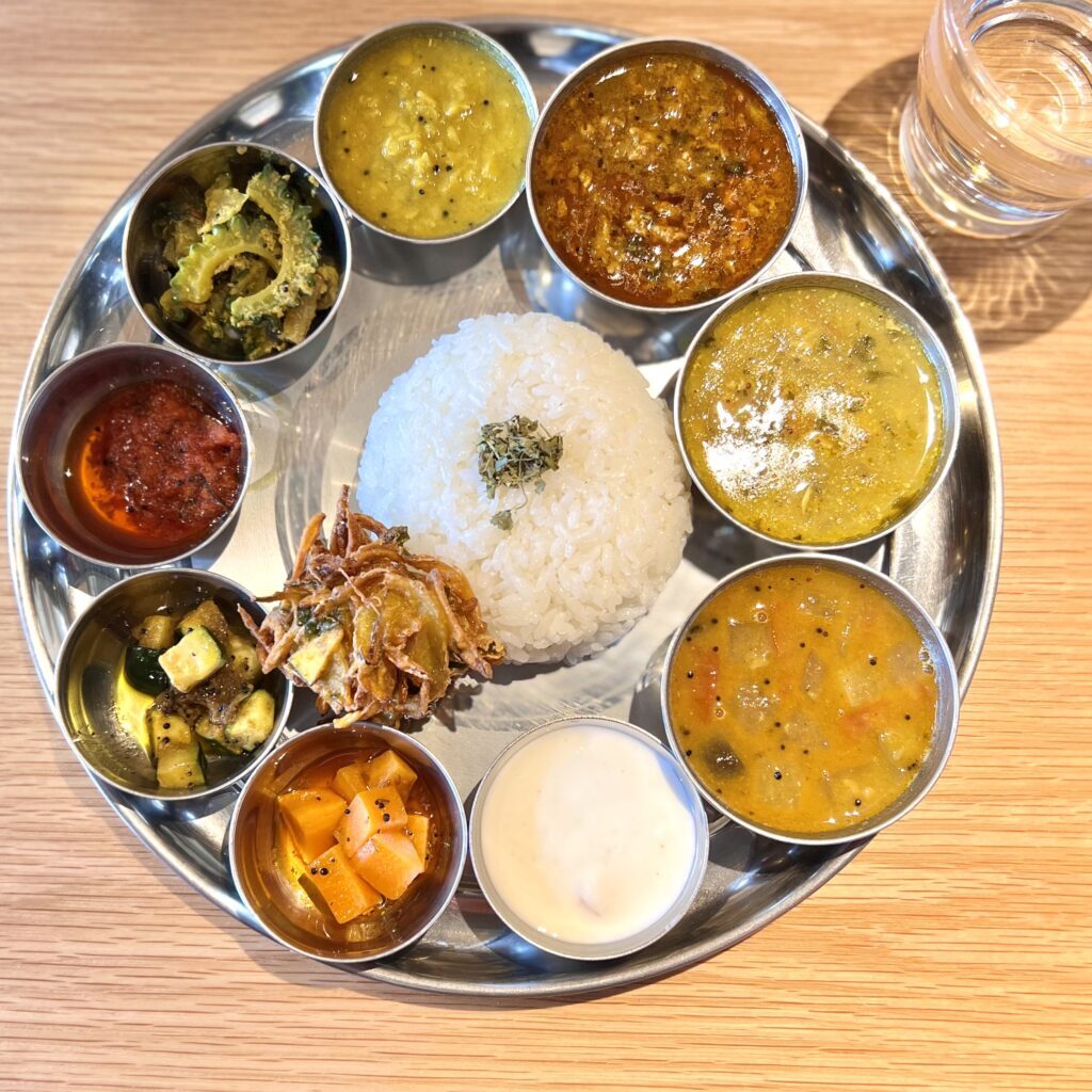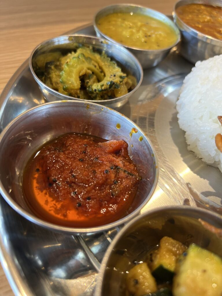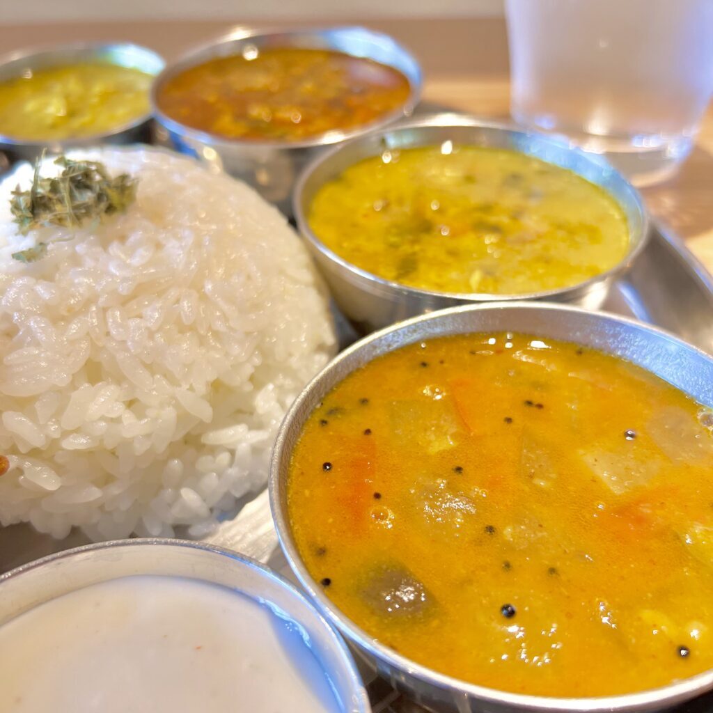 まずはそれぞれのカレーを楽しんで、最後は全てをご飯にかけ混ぜ混ぜして食べる、南インド式のいただき方。ちゃんとスプーンもお箸もついてますが、手食したいくらい。