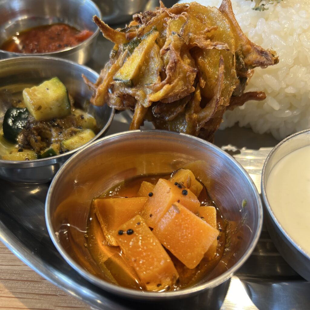 右側の少し大きめのお皿がカレー。ぐるっと一周副菜6種の小皿盛り副菜に囲まれ、ライスの上にはインドの天ぷら、パコラが添えられています。