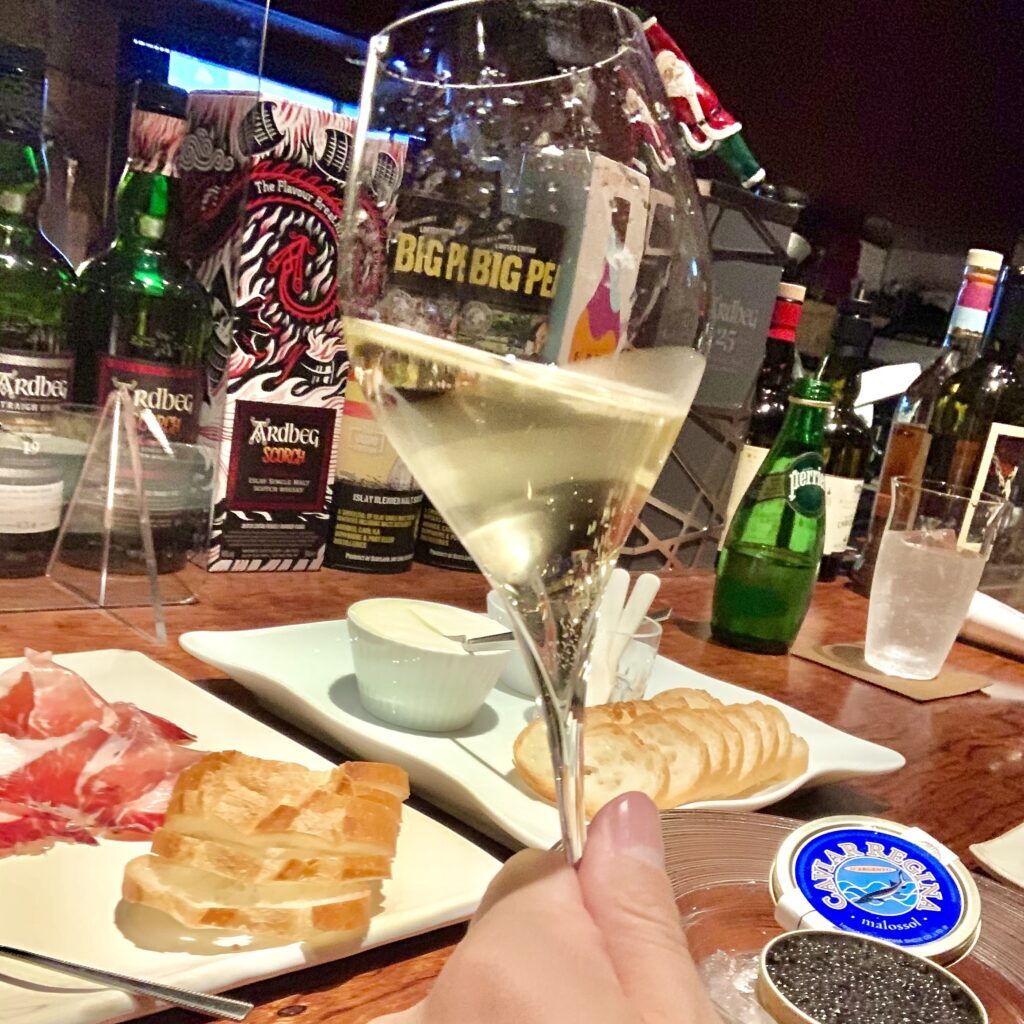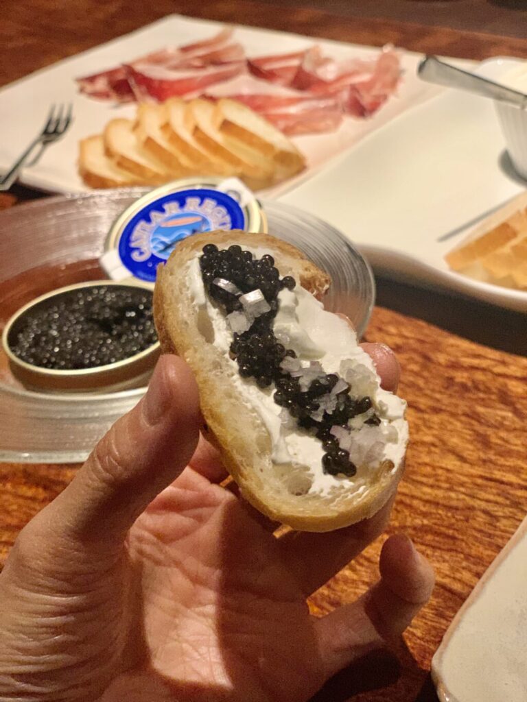 キャビア、チーズ、エシャロットをバゲットにのせて。白ワインといただきました。間違いない美味しさ!