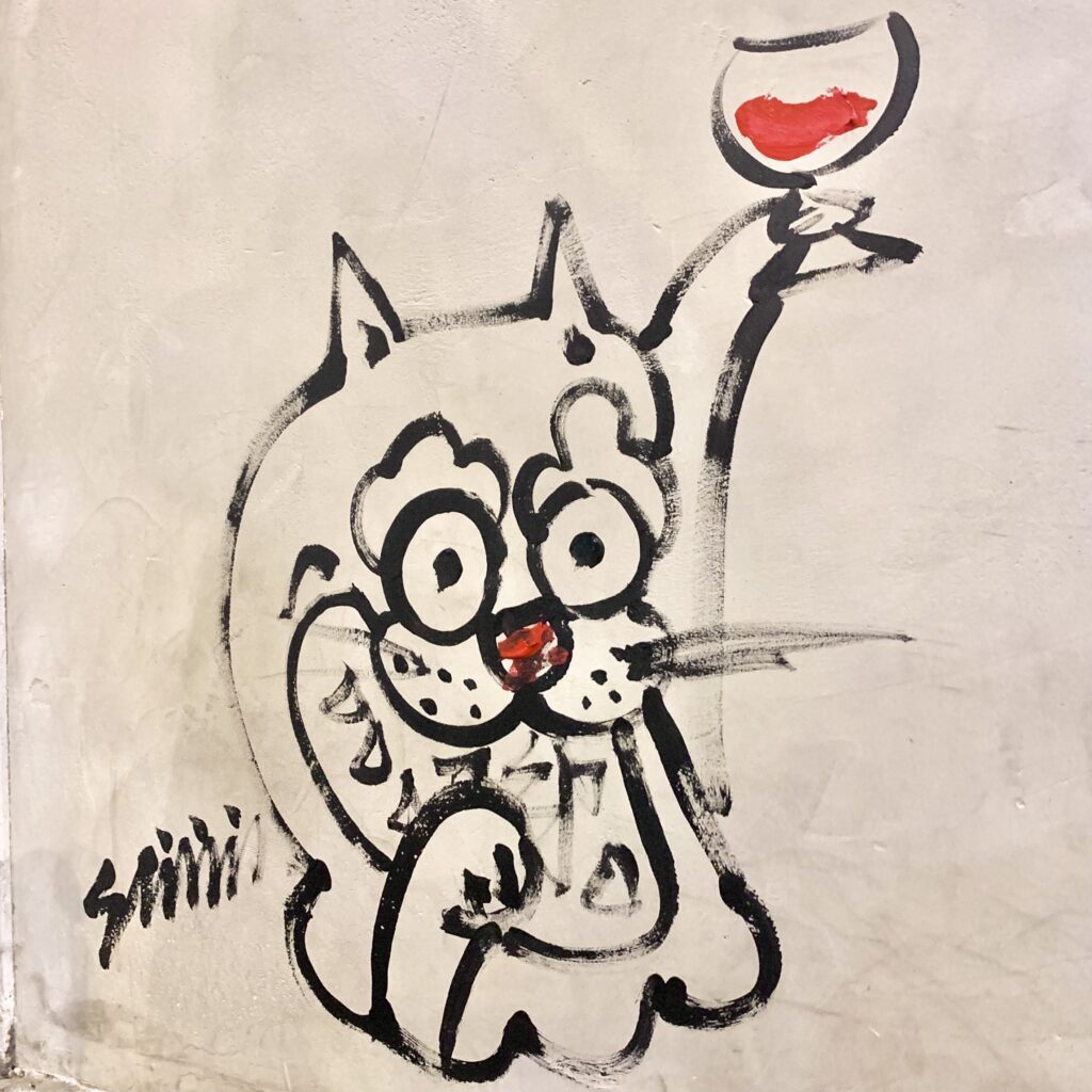 胡町にあるビルの1階、奥まった場所にあり、隠れ家的なバーです。目印は壁に描かれた猫とワイン、それから、小さくおしゃな看板です。