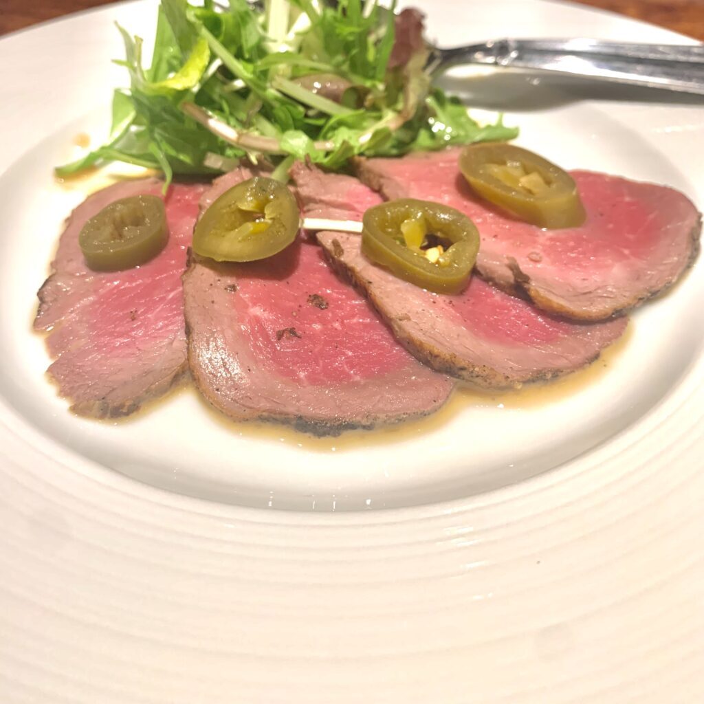 カプレーゼ、ローストビーフ、オニオングラタン、頬肉の煮込み。どれもワインに合うものばかり!ワインは合うものをセレクトしていただけます。