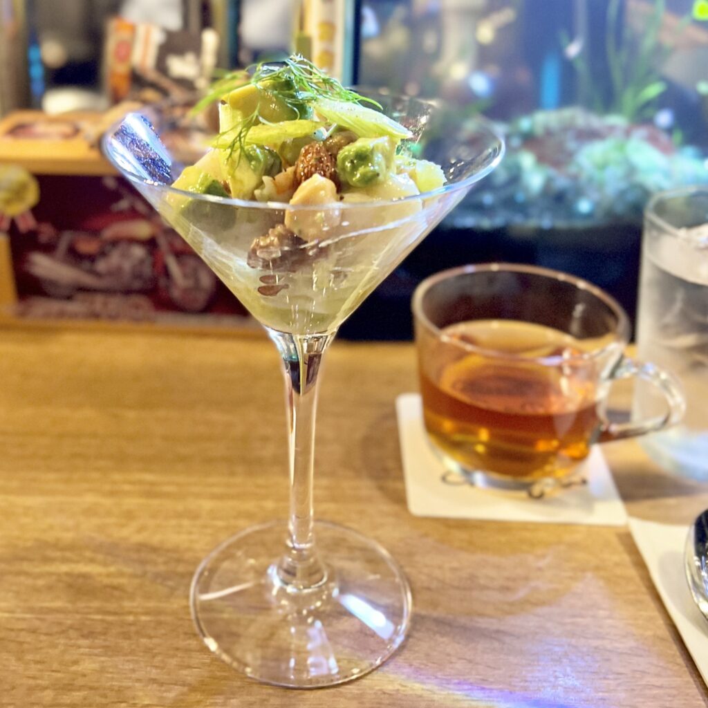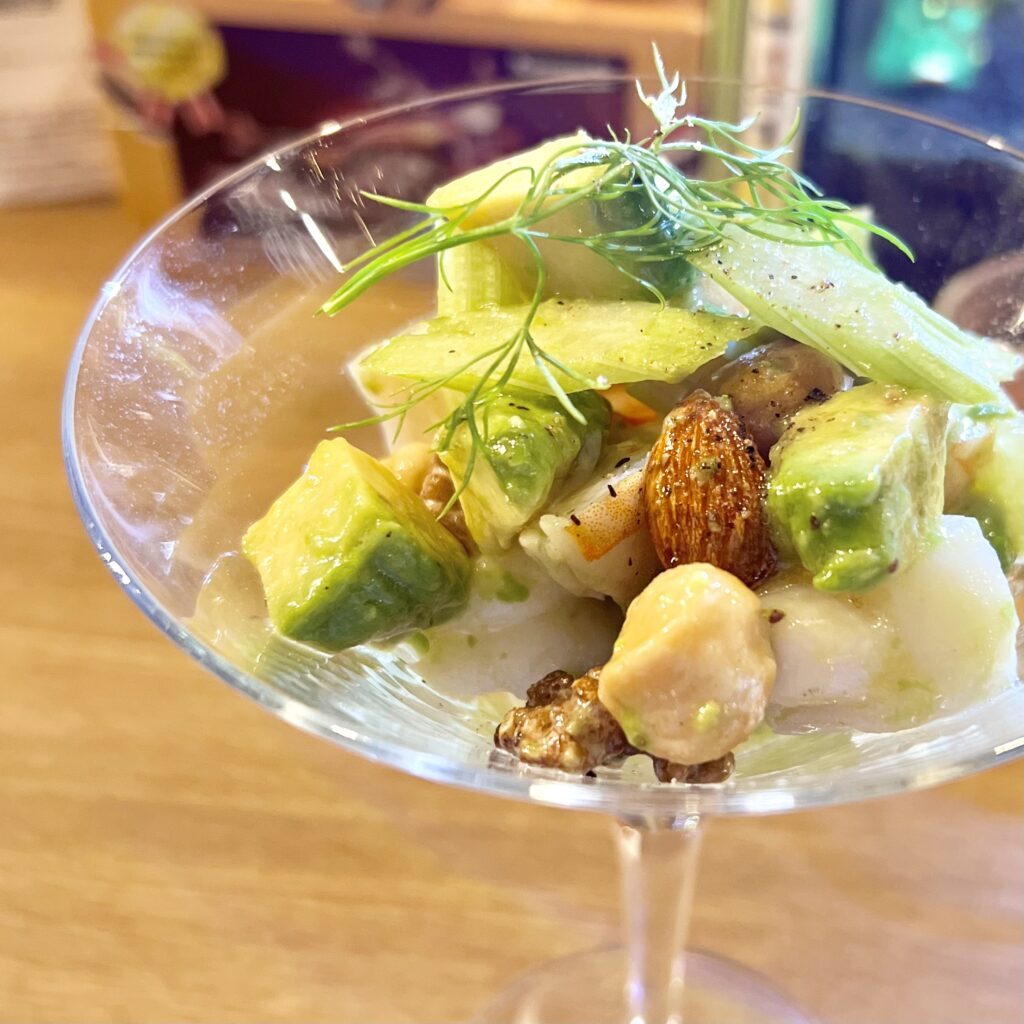 最初にお願いしたのが、ナッツと、魚介類がマリネされた一品メニュー。カクテルグラスで提供されました!盛り付け可愛い。