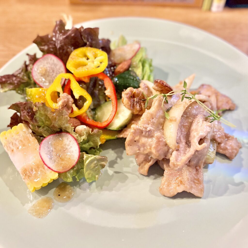 炒め物には色とりどりなサラダもついていて嬉しい。とうもろこしや、カボチャなどの焼き野菜なども入っていて、こちらもバリュームもあり。