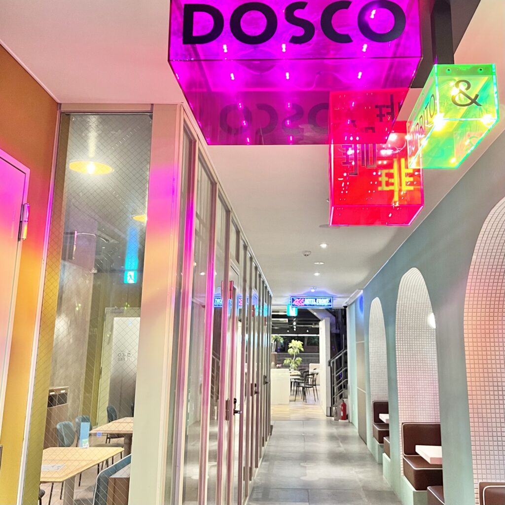 夜のテイクアウトグルメで利用したドスココーヒー。表側は流川通り面していて、紫色のネオンが目印です。
