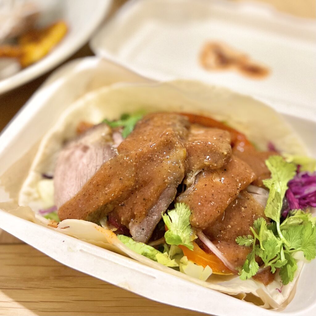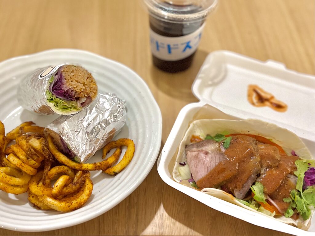 BBQローストポークのタコスと、チキンのブリトーに決定!カーリーフライとドリンクが付くセットにしました。
