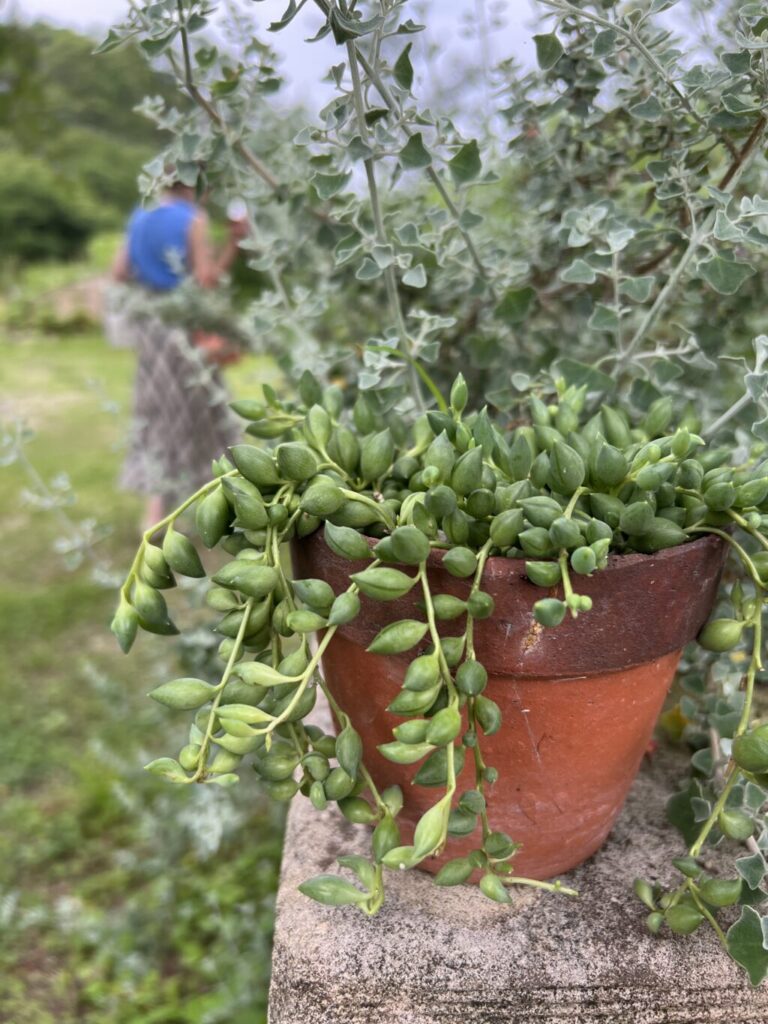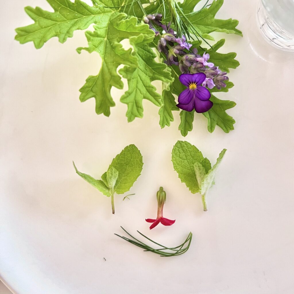 さらに、真っ白のお皿に乗せられたデザートをお庭(ポタジエ)から好きな植物を飾って自ら完成させます。