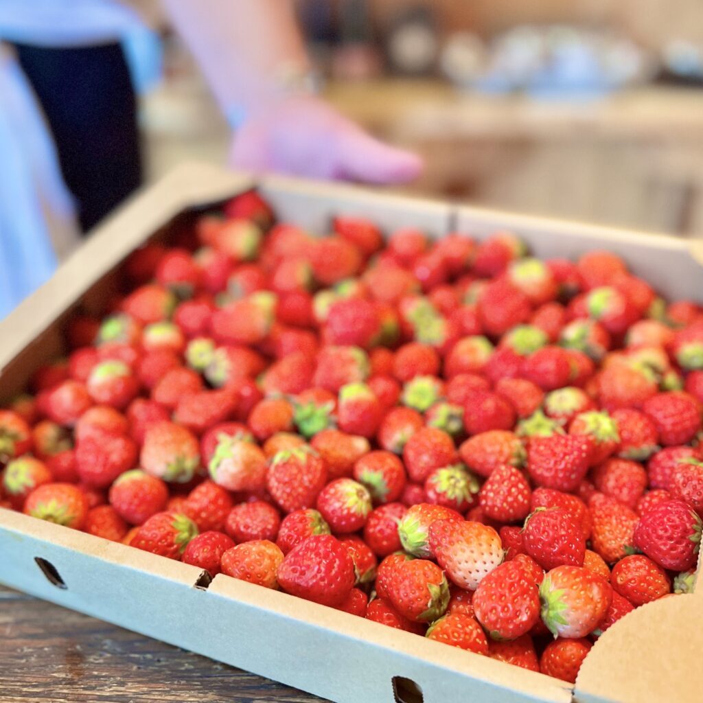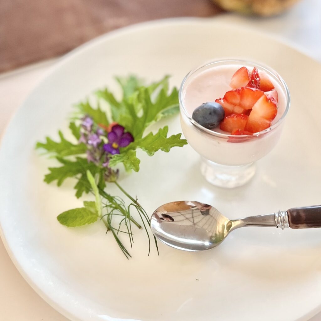 最後はデザート。江田島さんのイチゴを使ったパンナコッタ。いちごは規格外の大きさのものを使い切るレシピ。