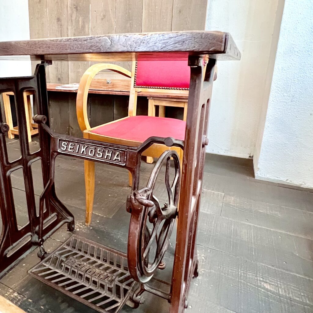 アンティークを感じる店内のテーブルは、全て足踏みミシン。緊張感のある階段とのコントラストで、癒しを感じる空間になっています。