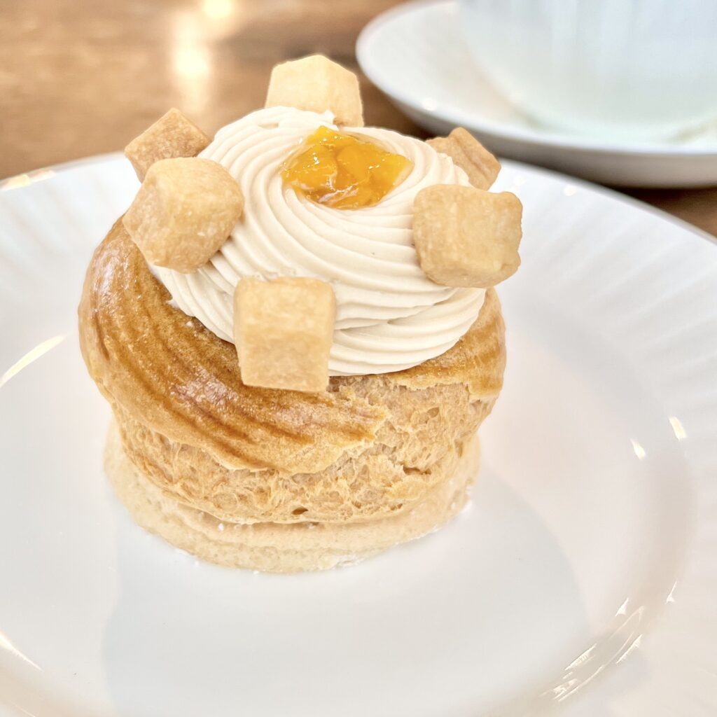 サクサクのスクエアクッキーがデコレーションされた、しっかりしっとりとした食感のシュークリーム。