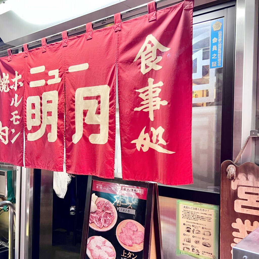 広島駅の西側に広がる、通称「エキニシ」にあるニュー明月。真っ赤な看板と暖簾が目印です。