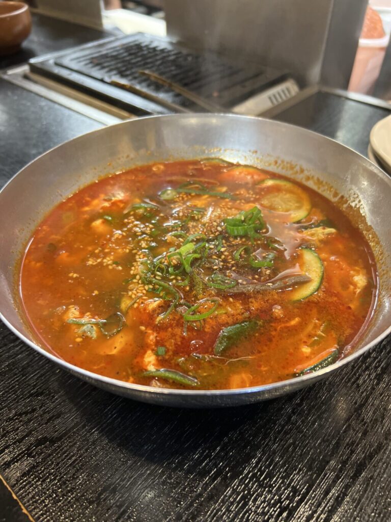 最後にユッケジャンスープ。スープも韓国で食べた味そのもの!メンタイの塩気や牛骨の出汁の出た、奥深いスープです。