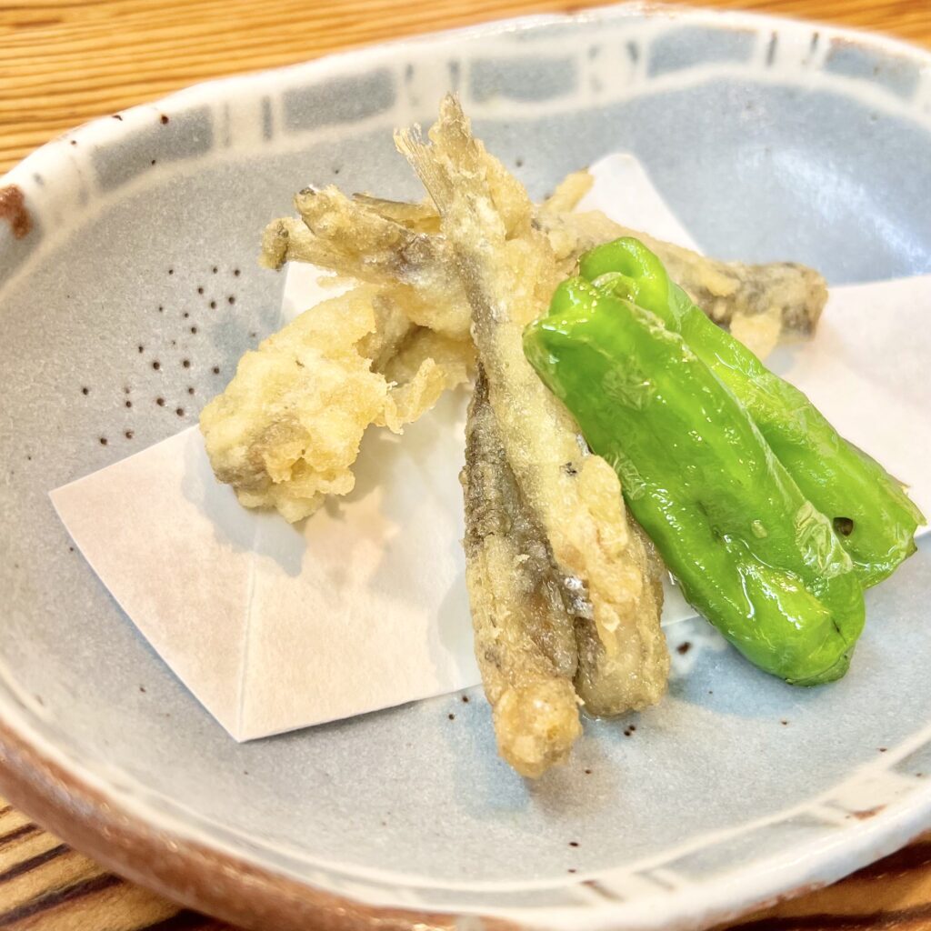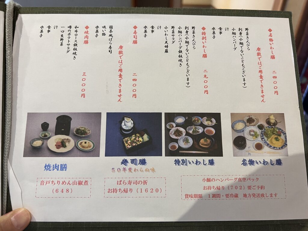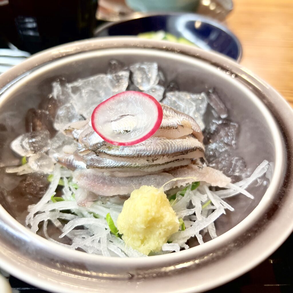 「特別いわし膳」この日は運良くお刺身も小鰯でした。おすすめの時期は小鰯漁の始まる6〜7月。